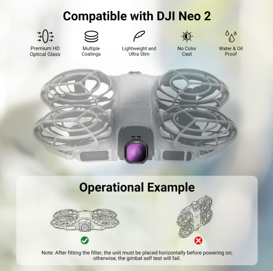 • Compatible with DJI NEO 2- Only compatible with DJI NEO 2 Drone. This filter accessories kit includes 1x UV, 1x CPL (circular polarizing), and 4x ND filter. Lightweight and slim, they preserve the precise gimbal performance