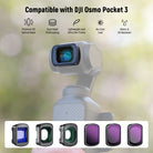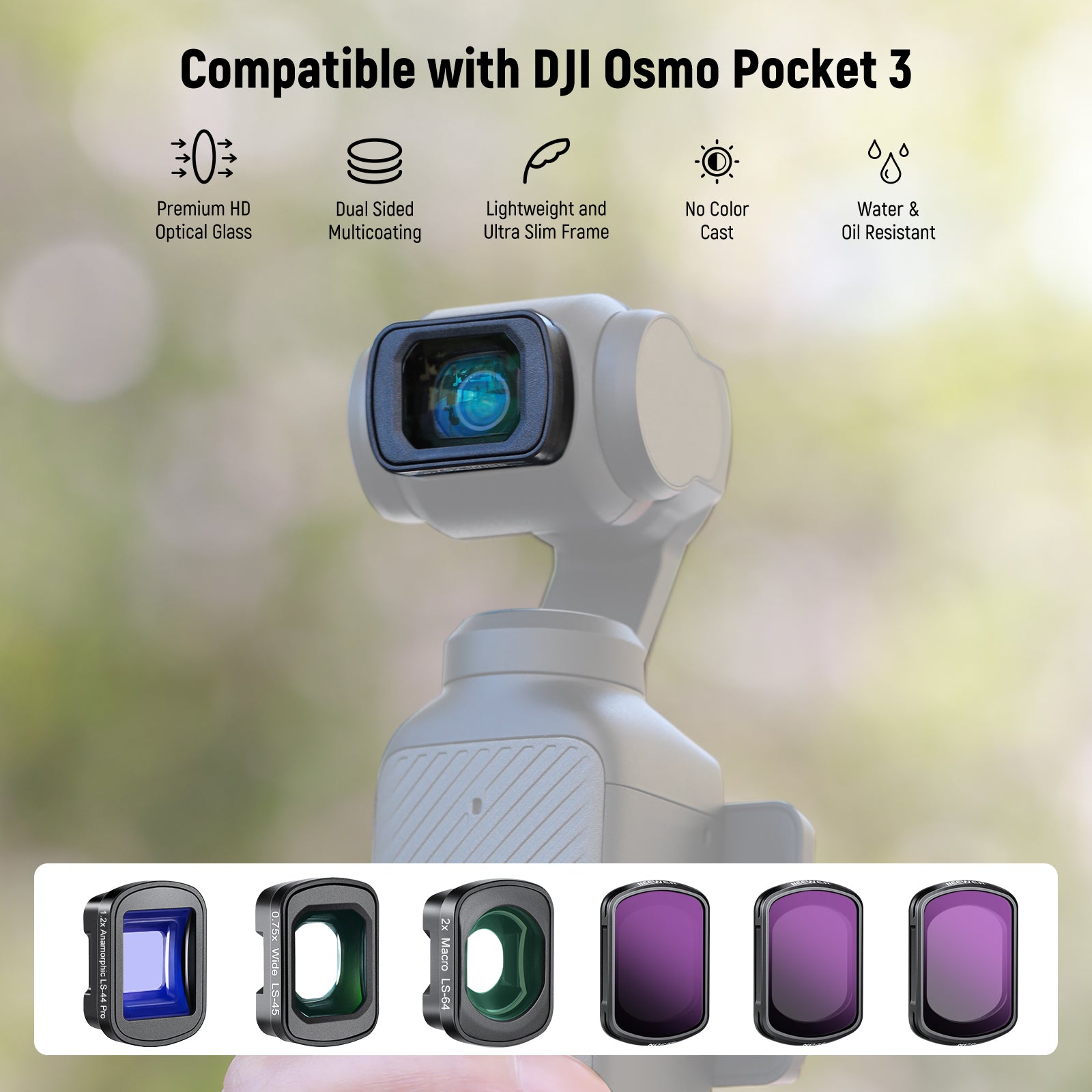 - Compatible with DJI Osmo Pocket 3- This filter and lens accessories kit is designed for Osmo Pocket 3 Gimbal Camera. It offers three filters, a 0.75X wide angle lens, a 2X macro lens, a 1.2X blue anamorphic lens, and two screen protectors, Quickly attach to your camera via magnets and remain in place during shooting for action packed moments as content creator essential and influencer must have photography gear