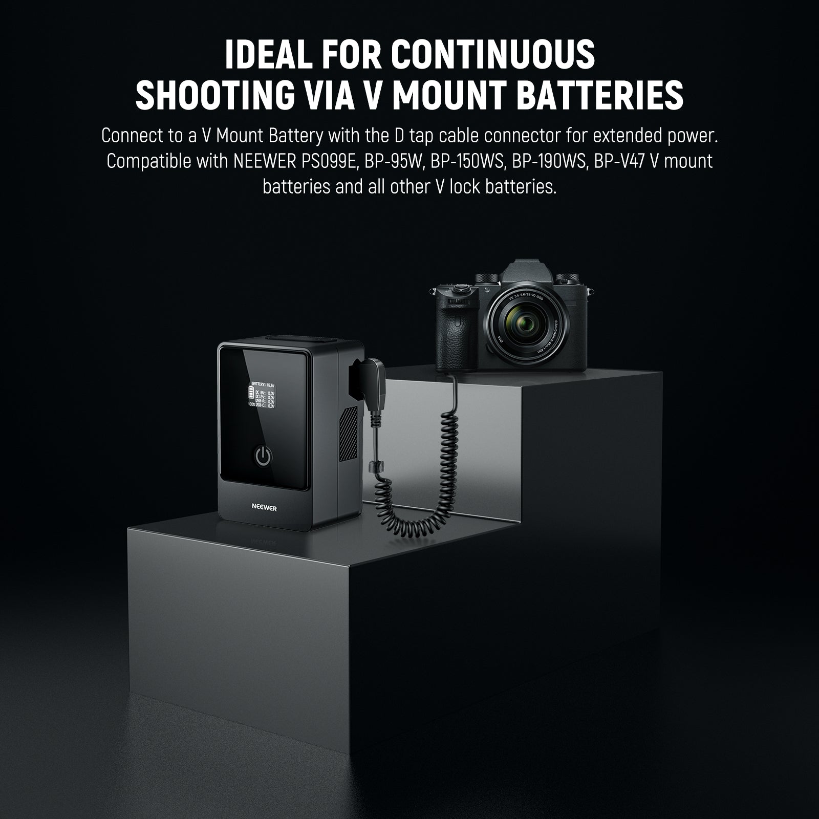 - Ideal for Continuous Shooting Via V Mount Batteries- With a D tap cable connector, it can work with NEEWER PS099E, BP-95W, BP-150WS, BP-190WS, BP-V47 V mount batteries and all other V lock batteries. Compatible with SmallRig v mount battery Series, compatible with Sony BP-U65 BP-U68 BP-U100 BP-U90 V mount batteries