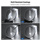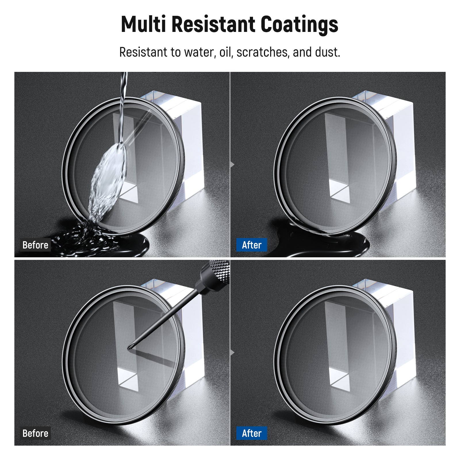 - Multiple Resistant Coatings- Multiple resistant coatings protect the filter from water, fingerprints, smudges, dust, and scratches during everyday shooting. Three included cleaning cloths keep the filter spotless