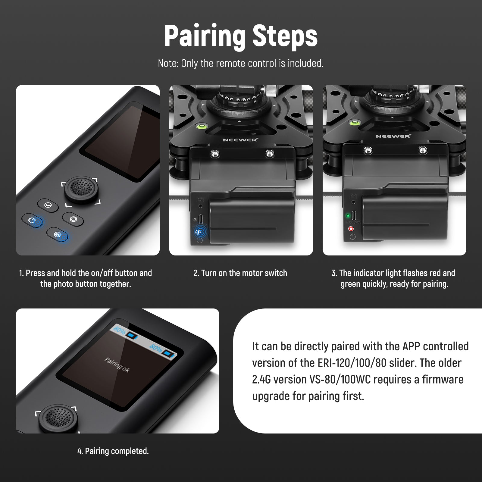 - Pairing Steps- Without requiring a firmware upgrade, the App controlled slider line (ER1-120, ER1-100, and ER1-80) and the newest generation of 2.4G control slider VS-80WC/VS-100WC can be paired with the remote by following these steps: 1. Long press the On/Off key and camera key; 2. Turn on the motor switch; 3. The indicator light flashes rapidly in red and green; 4. Pairing is completed