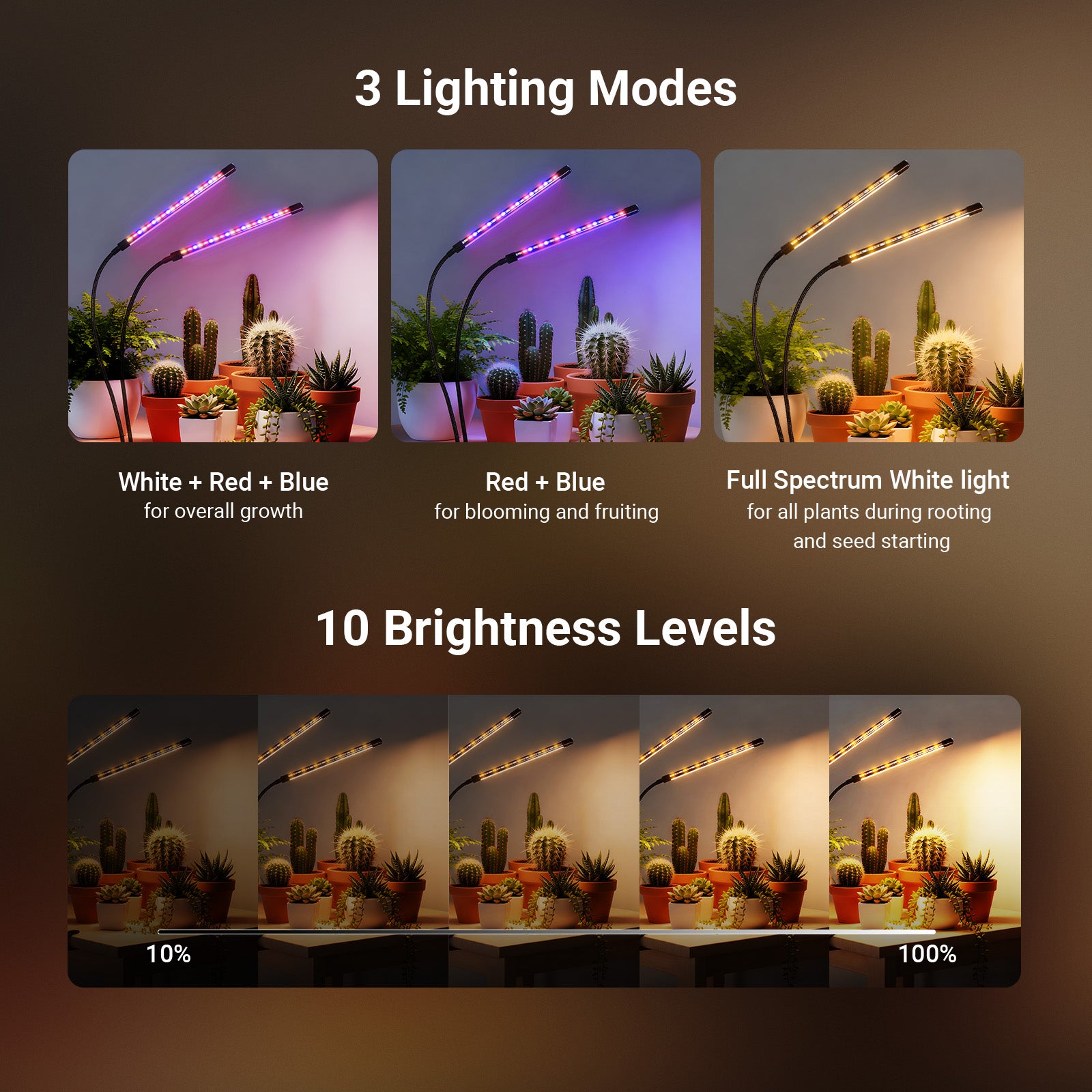- Dimmable with 3 Modes- The adjustable grow lights for indoor plants offers 3 lighting modes and 10 brightness levels. Full Spectrum White light: for all plants during rooting and seed starting; Red + Blue: for blooming and fruiting; White + Red + Blue: for overall growth
