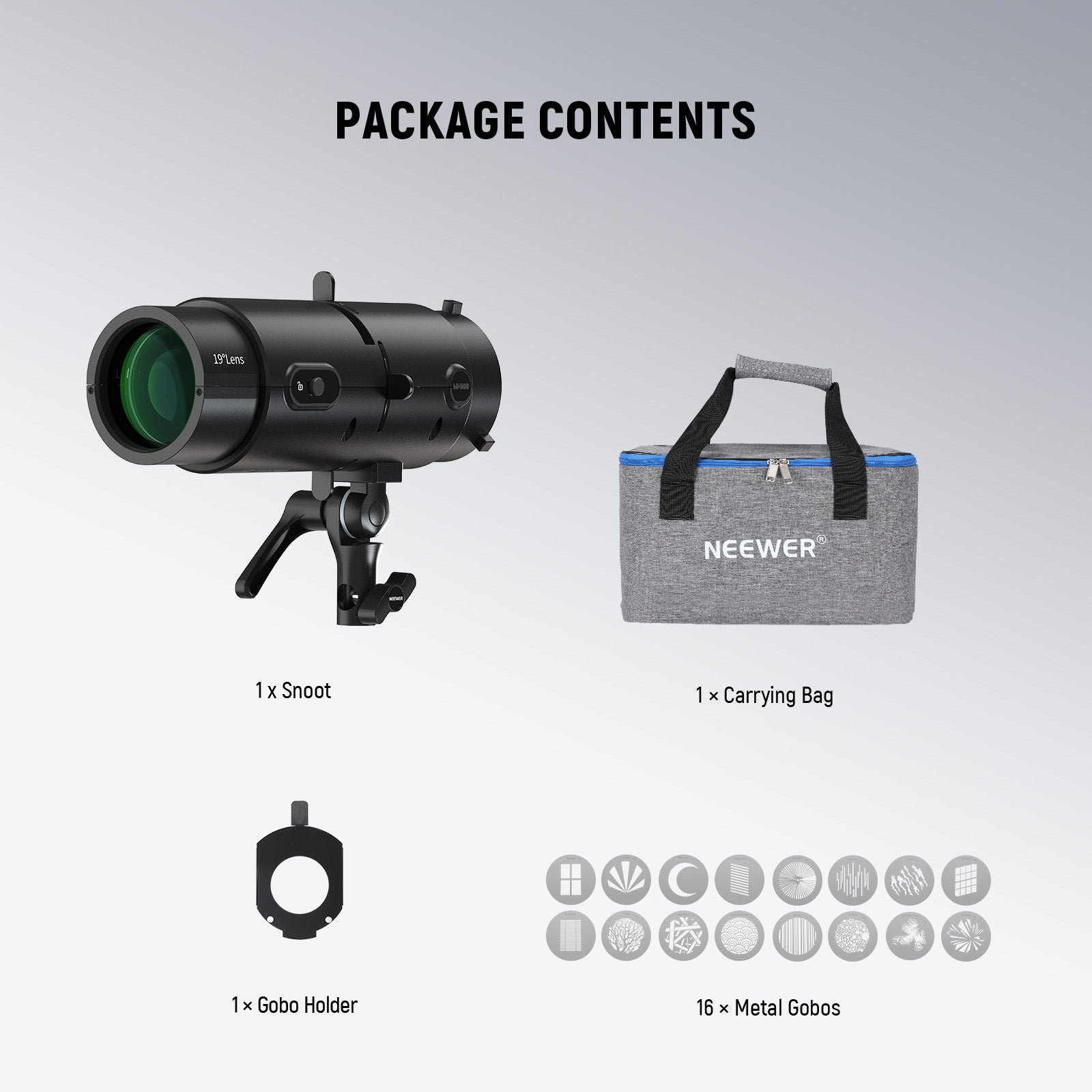 - Package Contents + Usage Guide- Includes 1 x spotlight, 16 x gobo, 1x gobo holder, and 1 x carrying case. Notes: 1) Always use on a light rated 300W or lower. 2) Turn off the light every 30 minutes and let it cool for 5 minutes. 3) To prevent burns, wear protective gloves to handle the spotlight during and after use