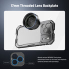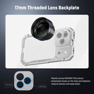 • 17mm Phone Lens Backplate - Mounts 105mm macro, 10x macro, 8mm fisheye, 45x microscope with LED light, 7x telephoto, 60mm telephoto, 18mm wide angle, 1.55x blue anamorphic, and other 17mm threaded NEEWER phone attachment lenses to the Main Camera and Telephoto Camera (lenses sold separately)