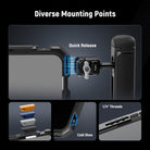 • Compatible with iPhone 17 Pro/Pro Max - This aluminum alloy cell phone cage video rig with shockproof rubber linings shields your phone during video recording, YouTube/TikTok vlogging, live streaming, mobile photography, and filmmaking like a gimbal stabilizer holder equipment as professional smartphone camera filming accessories. It includes three interchangeable backplates to connect filters and lenses for unlimited creativity. Note: Open the top bracket to install a backplate, then close it to secure