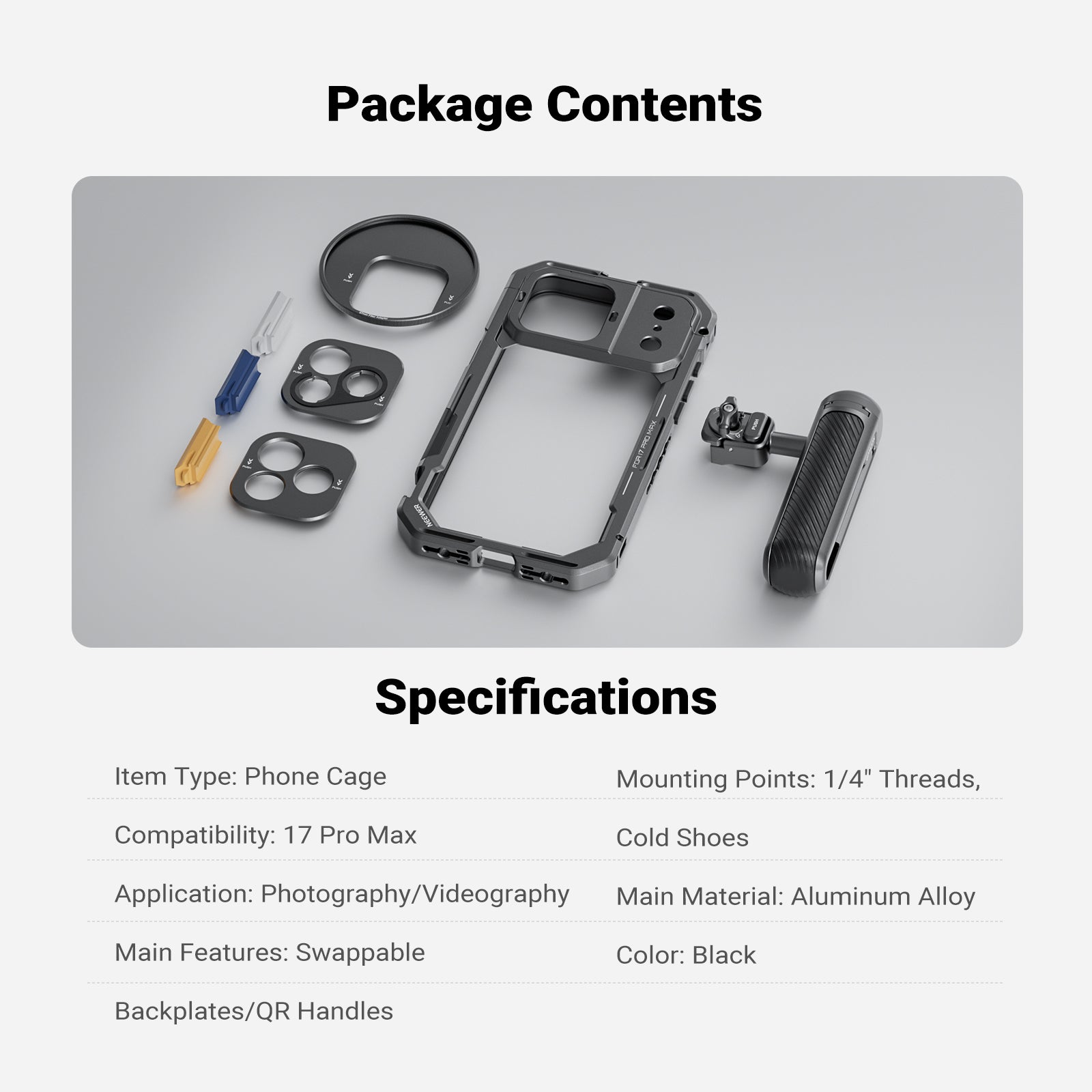 - Phone Cage for iPhone 17 Pro/Pro Max- Exclusively compatible with iPhone 17 Pro/Pro Max, the strong aluminum alloy video rig with shockproof rubber lining protects your cell phone during outdoor use