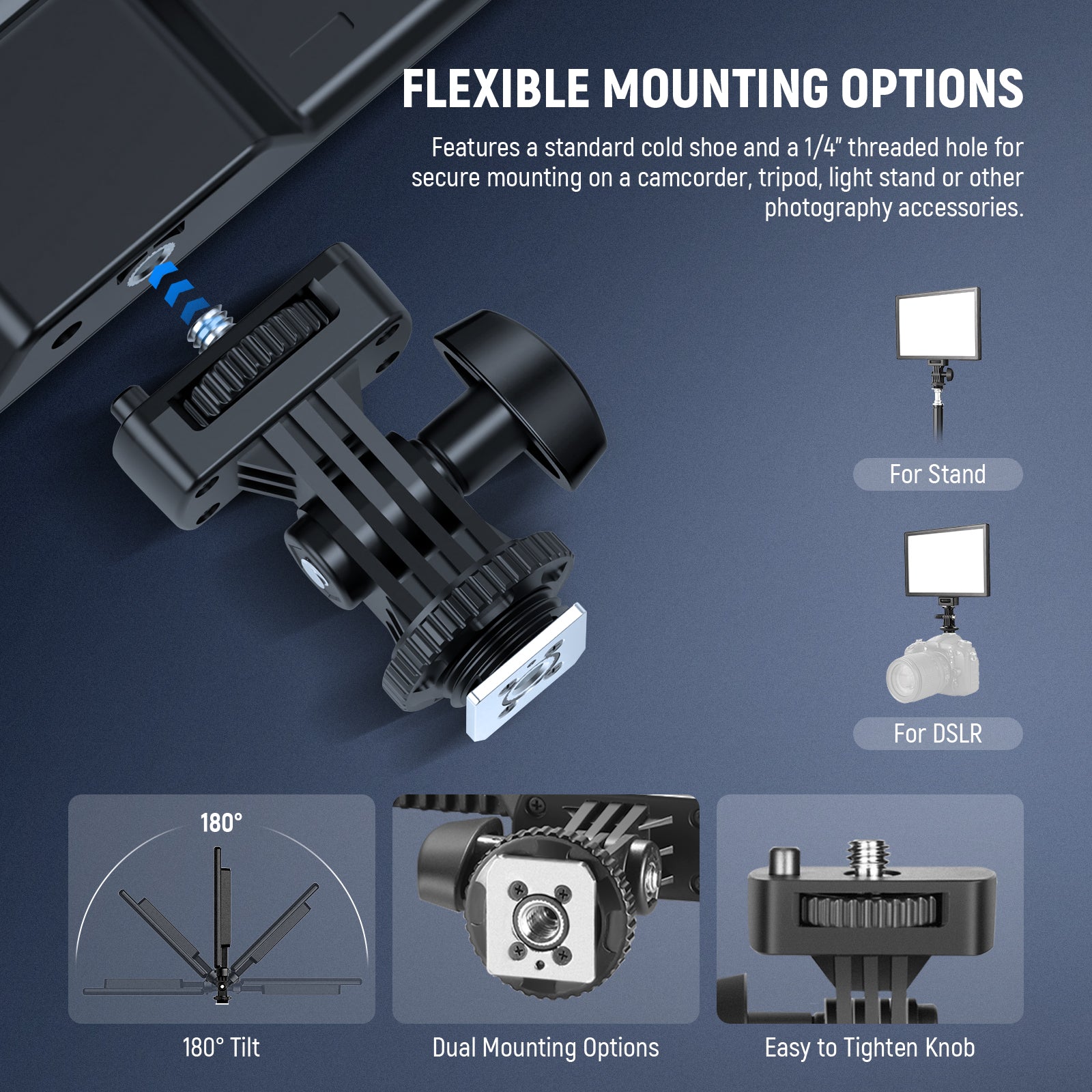 - Extendable Light Stand & 180° Tilts- The tripod stand adjustable from 21" to 70" (54-178cm), offering flexible height options to suit different shooting needs. Made of quality aluminum alloy, the stand supports loads up to 4lb (2kg), providing stable and secure support for the light. The LED photo and camera film light head tilts 180° forward and backward to cover versatile lighting angle