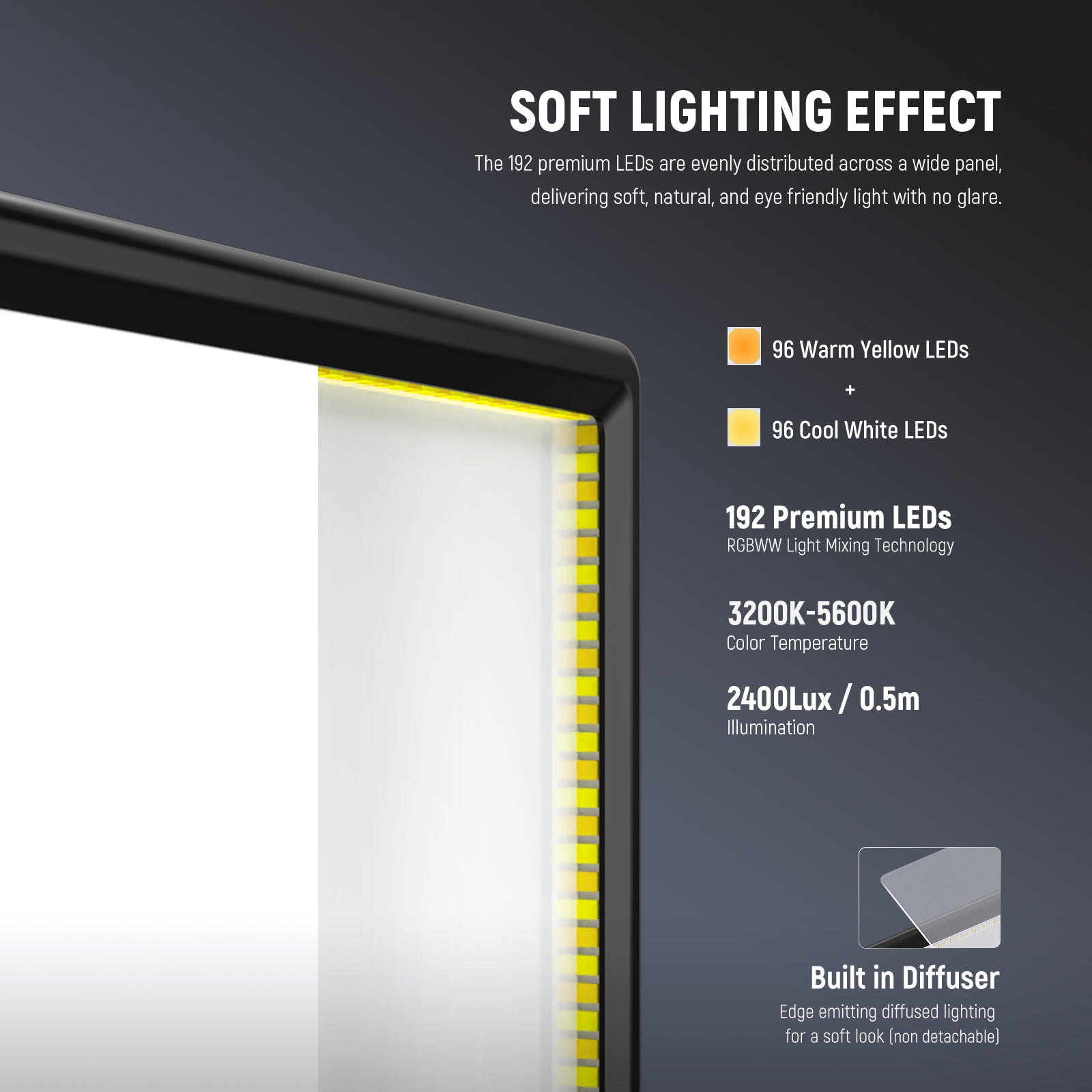 • Natural & Soft Panel Lighting- The 192 premium LEDs are evenly distributed across a wide panel measuring 10.55"x1"x7.4" (26.8x2.6x18.8cm), delivering soft, natural, and eye friendly light with no glare. It provides broad light coverage with minimal shadows and reduced dark corners. An HD LCD screen on the back of the light head clearly displays color temperature, brightness, and battery status for easy monitoring