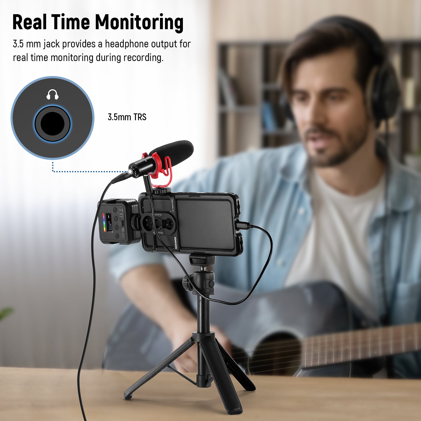 • Plug and Play Microphone- Directly plug the mic into your phone or computer via the USB C connector, and start recording clear sound on any recording app. The 3.5mm jack provides a headphone output for real time monitoring during recording