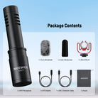 • Package Contents- 1 x Microphone, 1 x Cold Shoe Shock Mount, 1 x USB C Male to USB C Female Adapter, 1 x Furry Windshield, 1 x Foam Windshield, 1 x Storage Pouch, 1 x User Manual