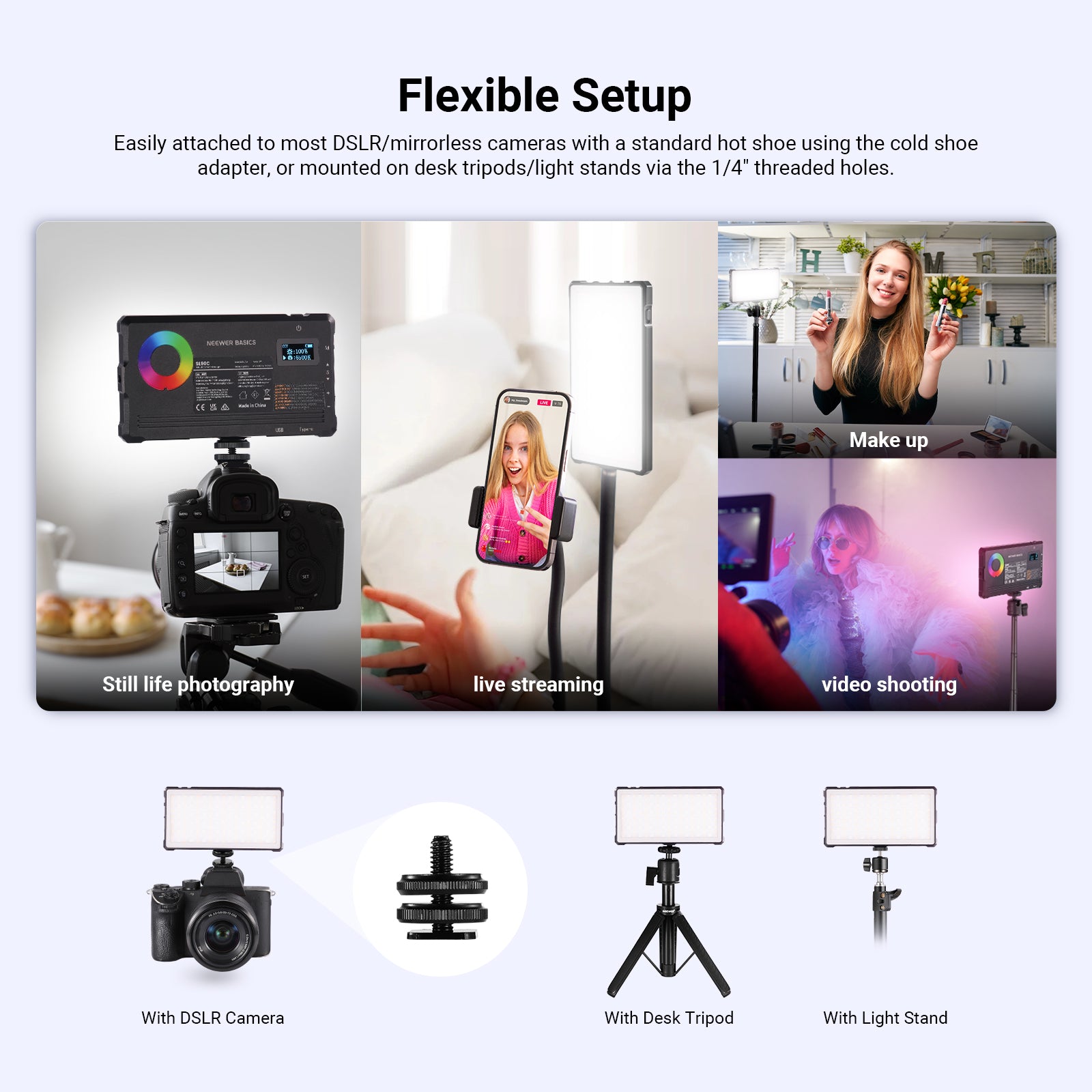 NEEWER offers a variety of mini lights, including small LED lights, phone selfie lights, handheld light sticks, and more. These compact lights are thoughtfully designed to meet the essential needs of most users, providing practical functionality without the added expense of over-engineered designs or premium materials. Lightweight and highly portable, these mini photography lights are perfect for on-the-go use. Choose a reliable mini light to elevate your photography with ease.