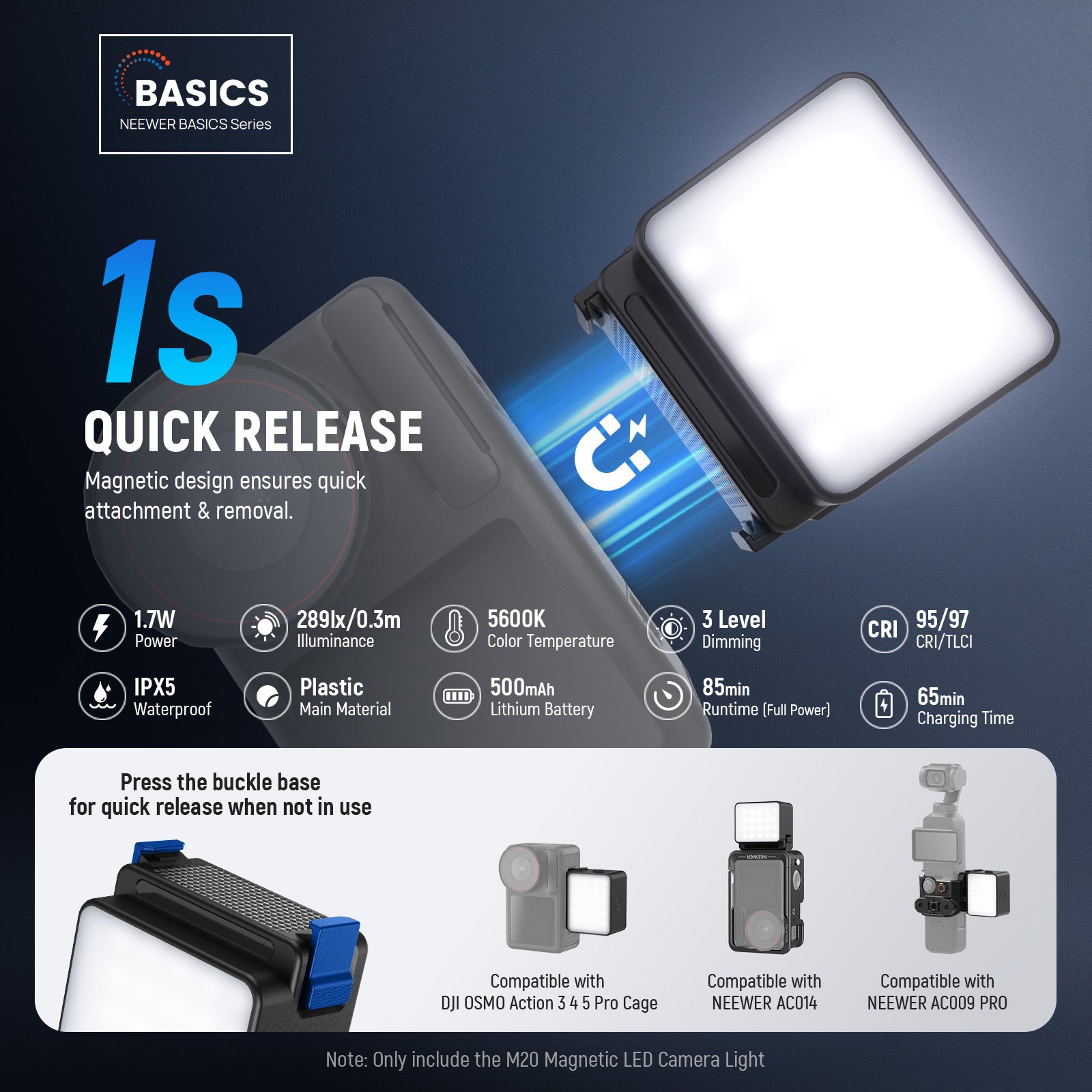 - Magnetic Setup & Quick Release- The video light features strong side magnets and plastic locking buckles that allow it to swiftly attach to your camera cage and snap securely into place, also available to mount on the NEEWER AC009 PRO Cage for OSMO Pocket 3. Ideal for dynamic photography and action packed videos as content creator essential and influencer must have lighting gear. Press the buckle base for quick release when not in use