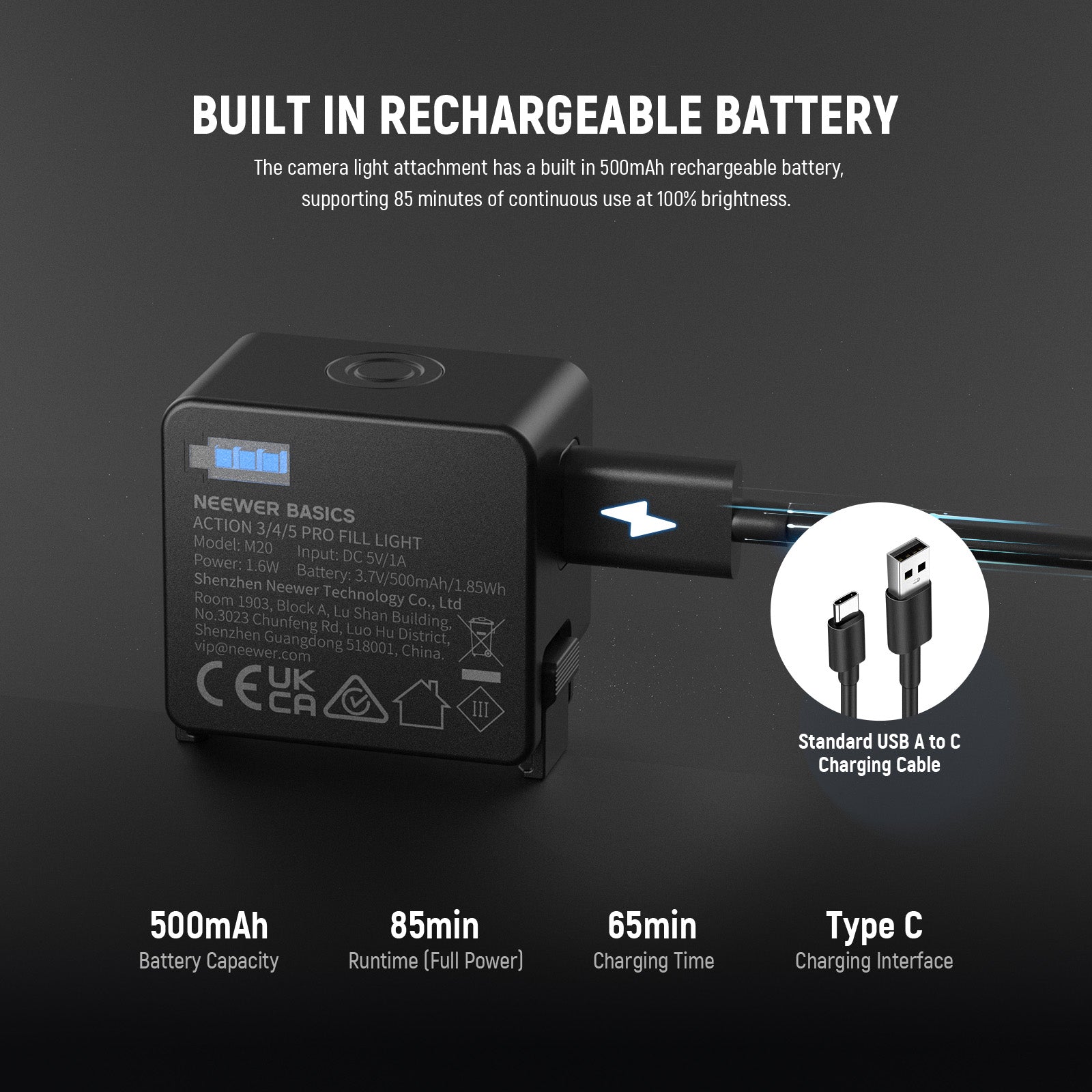 - Built in Rechargeable Battery- The camera light attachment has a built in 500mAh rechargeable battery, supporting 85 minutes of continuous use at 100% brightness. Fully recharged within 65 minutes using a portable charger or other USB power sources via USB C charging to provide prolonged lighting for selfies, vlogging, video recording, filming, videography, photography, YouTube TikTok social media films, or streamer live streaming. 3 indicators at the back display the remaining battery level