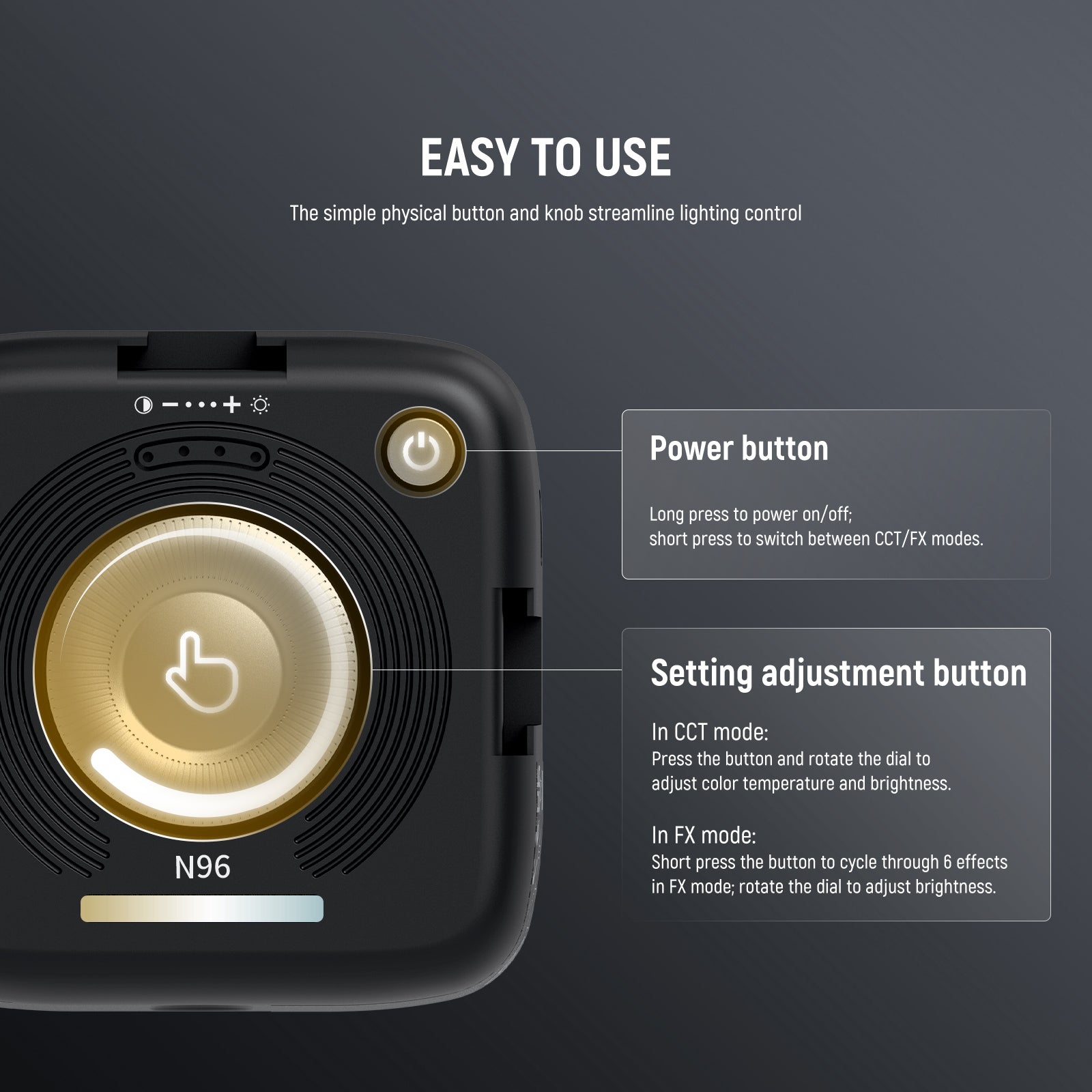 - Compact & Portable Camera Light- The N96 is a pocket sized mini LED fill cube panel light for cameras photography, measuring 3"x3"x1.4"/76x76x35mm, weighing only 3.8oz/108g with the diffuser. Also can be clamped on a laptop or magnetically attached to capture beautiful moments as a key or fill light. The simple physical button and knob streamline lighting control, essential gear and must have selfie light for social media content creators, makeup artists, live streamers, and influencers