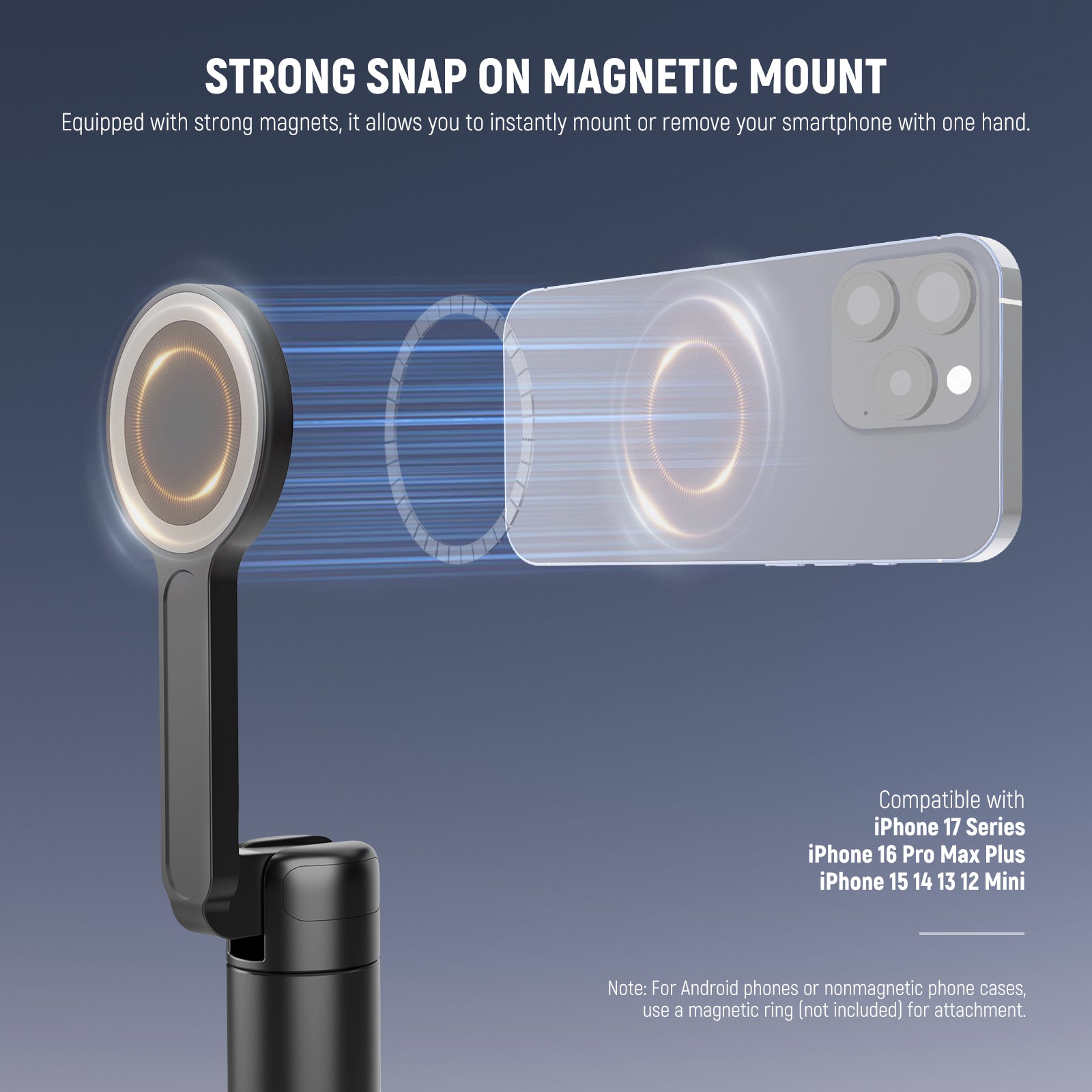 - Strong Snap on Magnetic Mount- With powerful magnets, the cellphone holder of this tall travel stick tripod stand ensures a firm grip and lets you snap your smartphone on or off the tri pod instantly with one hand, compatible with MagSafe iPhone 16 Max Plus Mag safe i Phone 15 14 13 12 Mini iPad Pro Samsung Galaxy S25 S24 Ultra, etc, as phone camera photography and gym filming accessories. For Android phones or nonmagnetic cases, use the included magnetic ring for secure attachment
