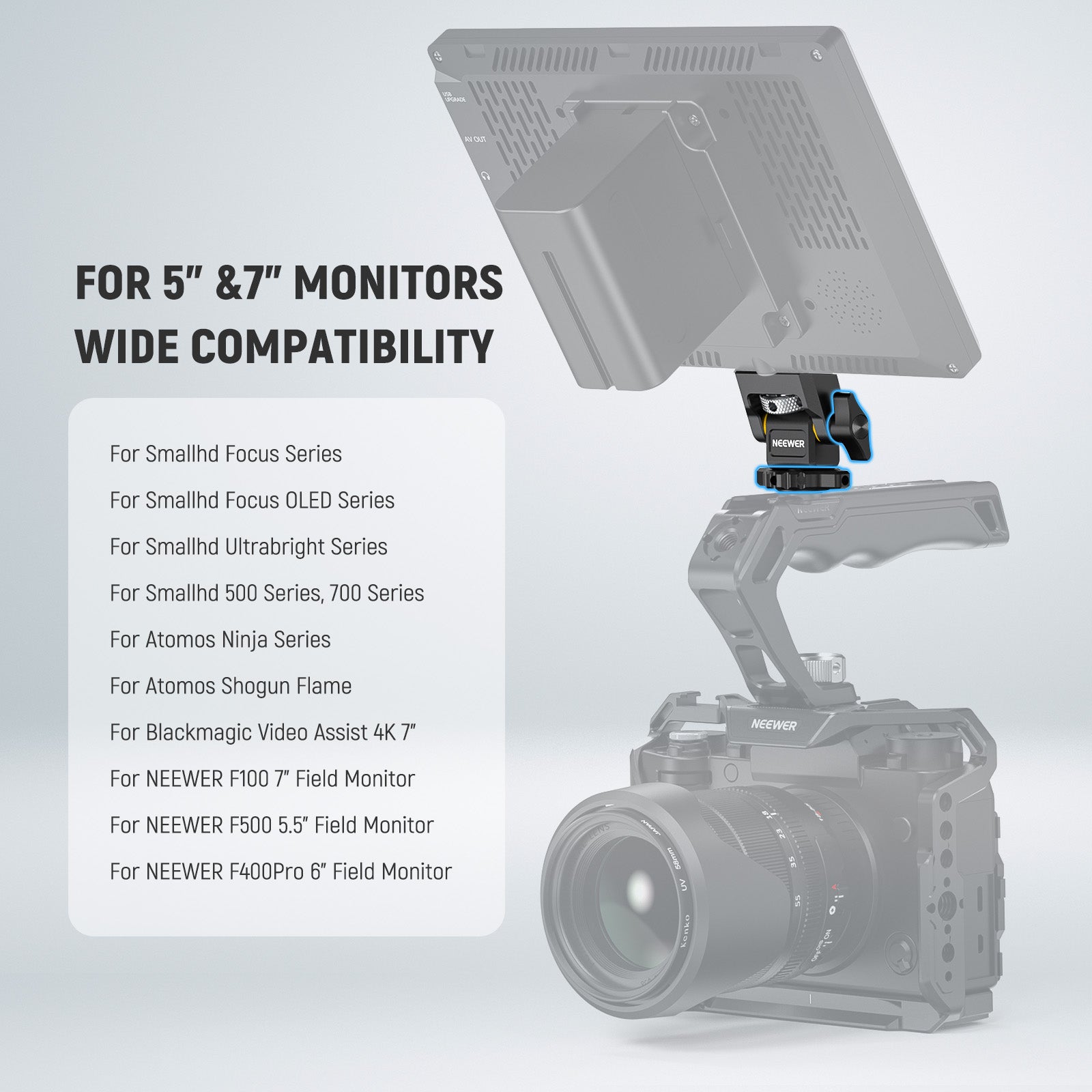 - Ideal for 5"~7" Field Monitors- Designed to support a 5"~7" camera field monitor for vlogging, filmmaking, and photography, this field monitor mount with a cold shoe can be mounted on NEEWER camera cages, video rigs, top handles, side handles, gimbal sling handles, and camera hot shoes (also compatible with SmallRig). The aluminum alloy construction is durable and resistant to harsh outdoor weather