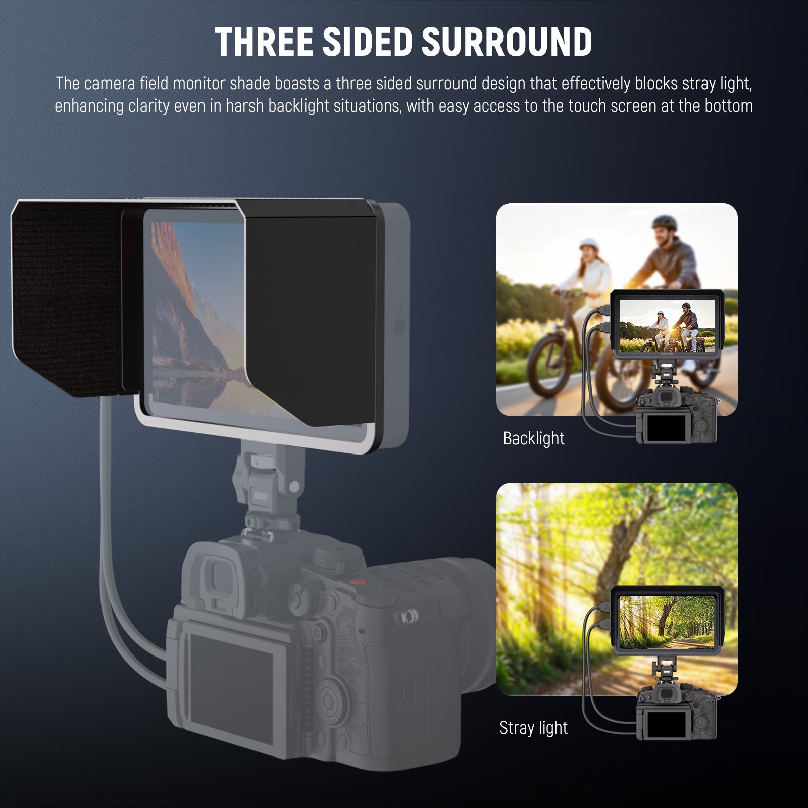 • Three Sided Surround- The camera field monitor shade boasts a three sided surround design that effectively blocks stray light, enhancing clarity even in harsh backlight situations, with easy access to the touch screen at the bottom