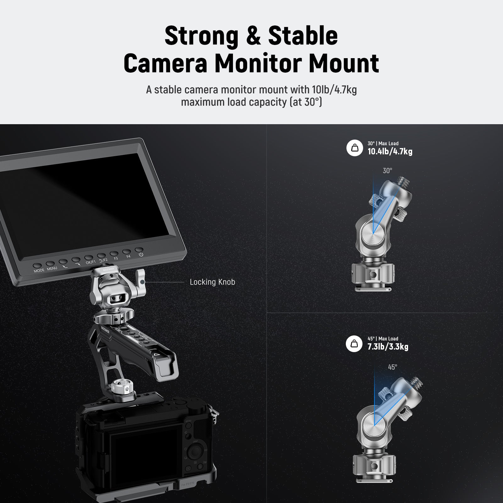 - Strong & Stable Camera Monitor Mount- A stable camera monitor mount with 10lb/4.7kg maximum load capacity (at 30°), it can securely support your field monitor for outdoor photography, location filming, and vlogging on the move
