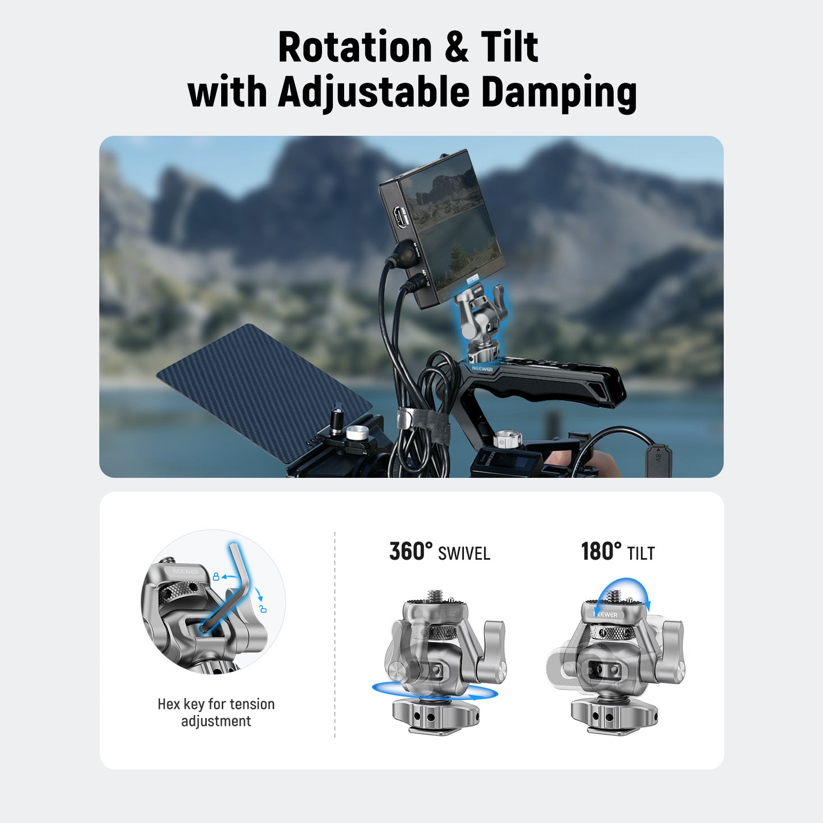 - Rotation & Tilt with Adjustable Damping- The field monitor holder bracket enables 360° rotation and 180° tilt. For more smooth and flexible positioning, use the included L shaped hex key to adjust the damping based on the monitor weight or your preferences