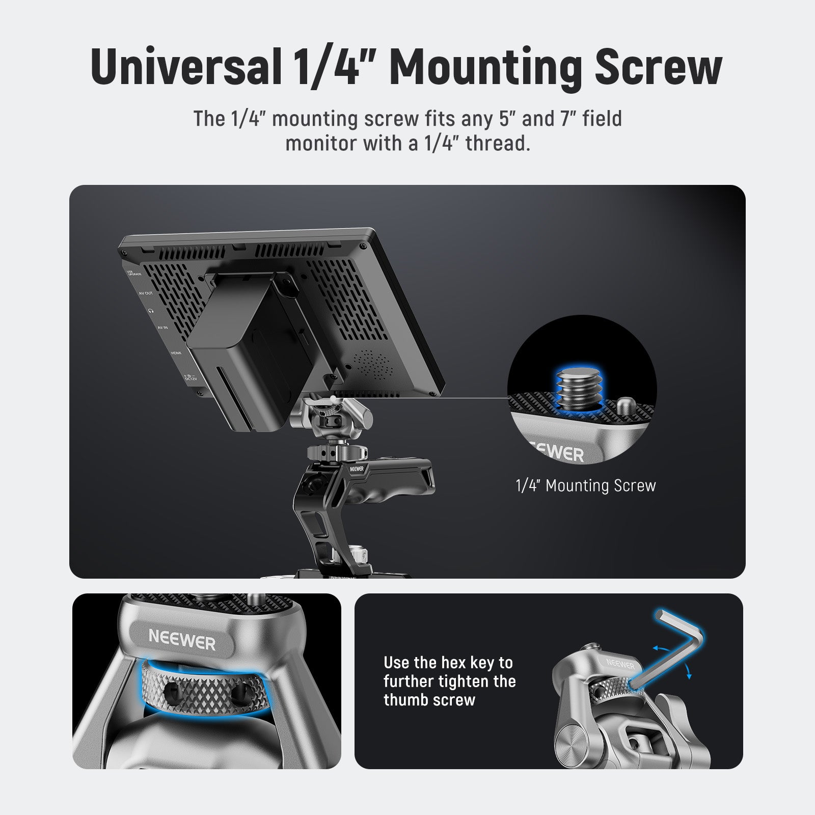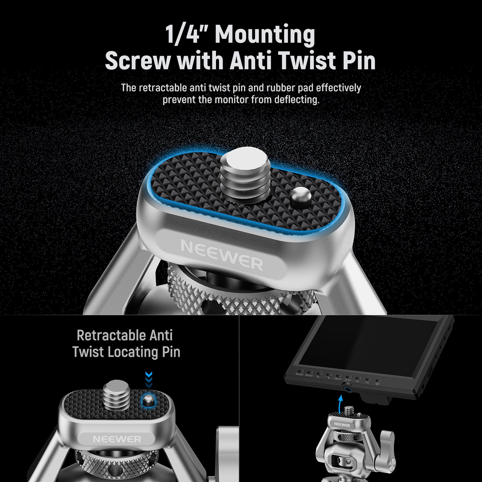 - 1/4" Mounting Screw with Anti Twist Pin- The retractable anti twist pin and rubber pad effectively prevent the monitor from deflecting. The 1/4" screw is compatible with NEEWER 5"-7" field monitors; compatible with SmallHD Focus OLED UltraBright 500 700; compatible with Atomos Ninja Shogun Flame; compatible with Blackmagic Design Video Assist 5" 4K 7"; compatible with Feelworld