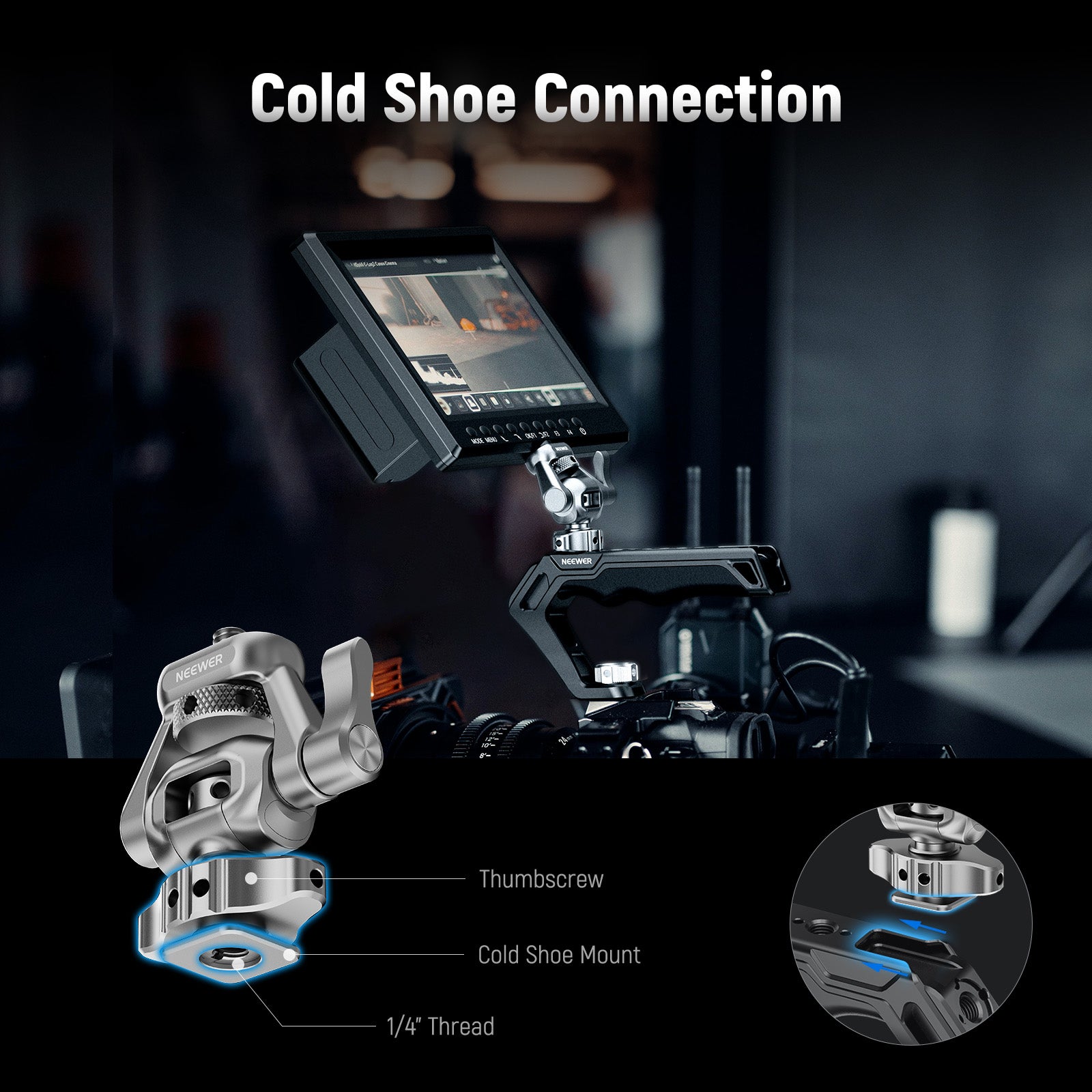 - Universal Cold Shoe Mount Adapter- Via the cold shoe adapter, this cold shoe monitor mount can quickly attach to a camera's hot shoe, a camera cage, or a top handle, and get locked with the thumb wheel
