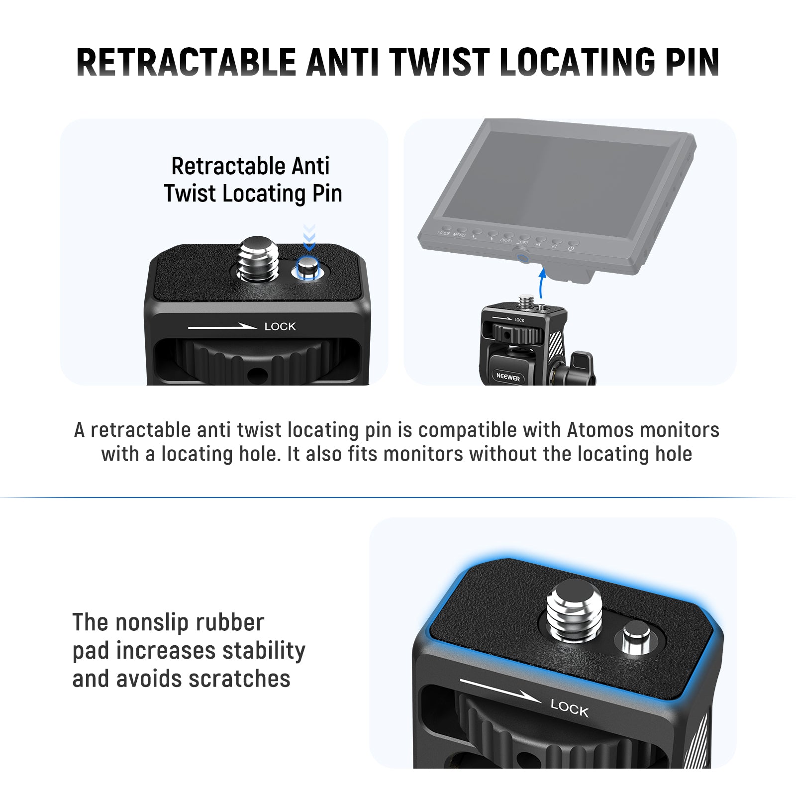 - Retractable Anti Twist Locating Pin- A retractable anti twist locating pin is compatible with Atomos Ninja V Ninja V+ and other monitors with a locating hole, or NEEWER F100 F700 monitors without a locating hole. The nonslip rubber pad adds stability and prevents scratches