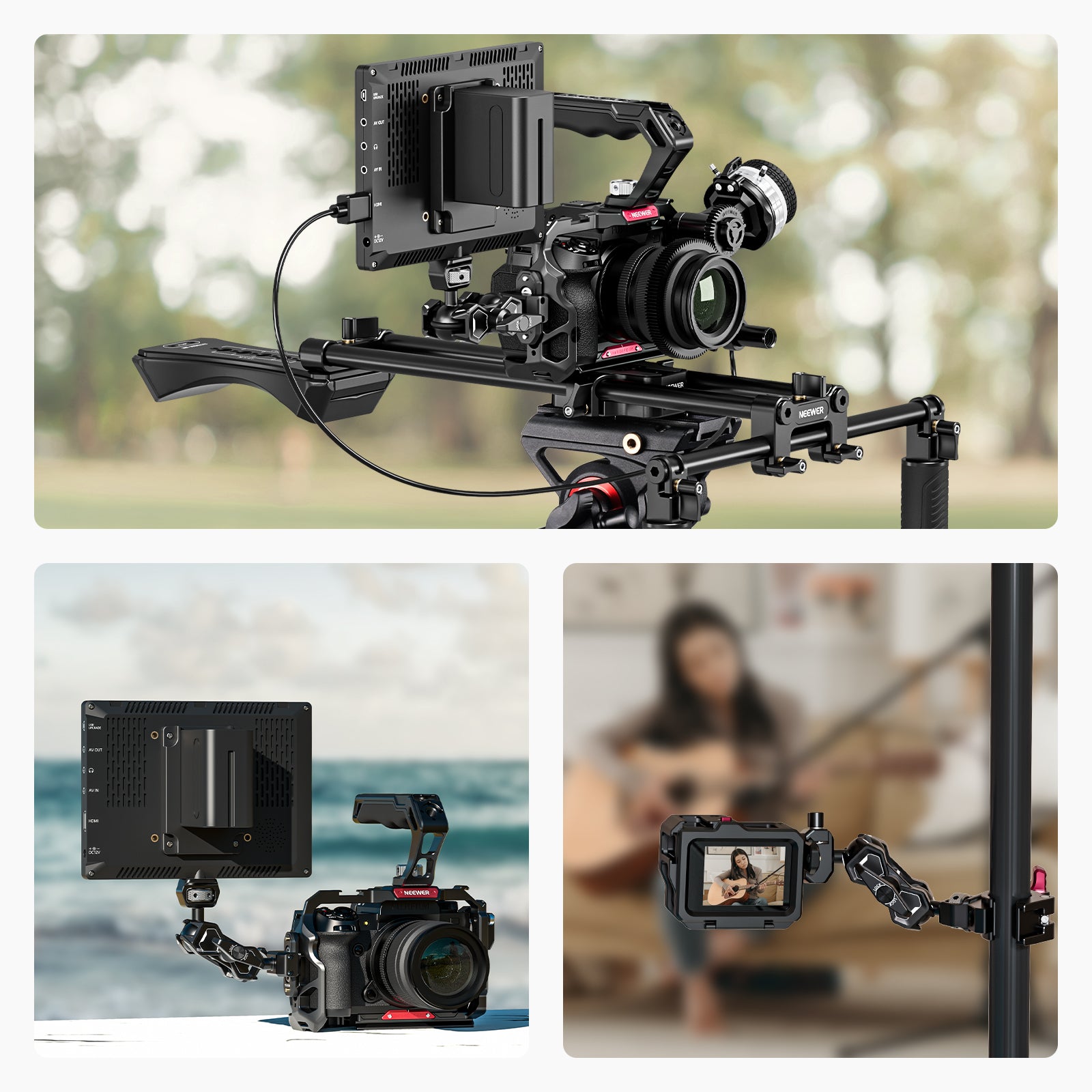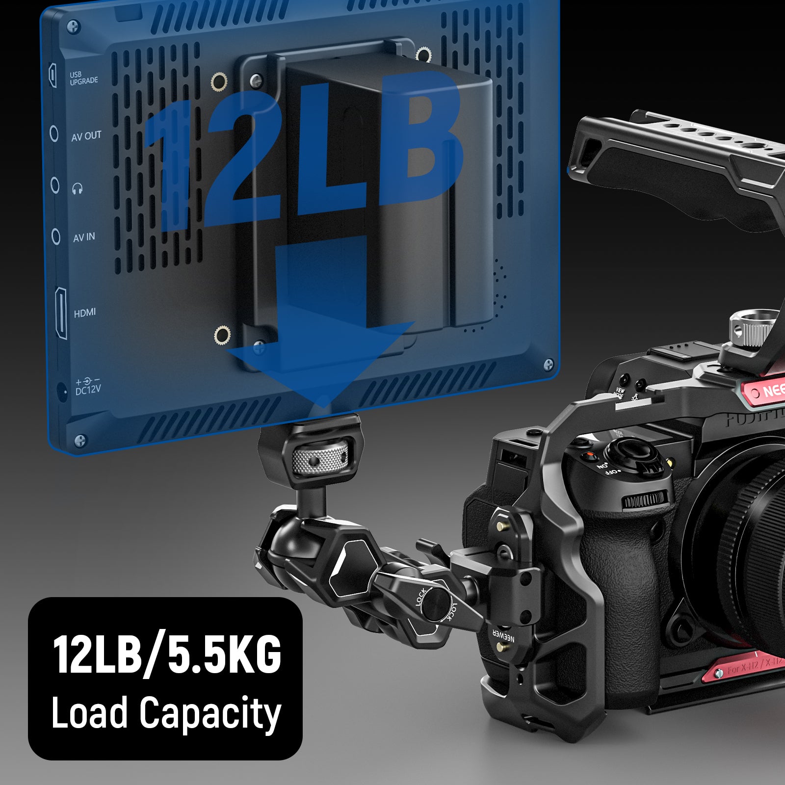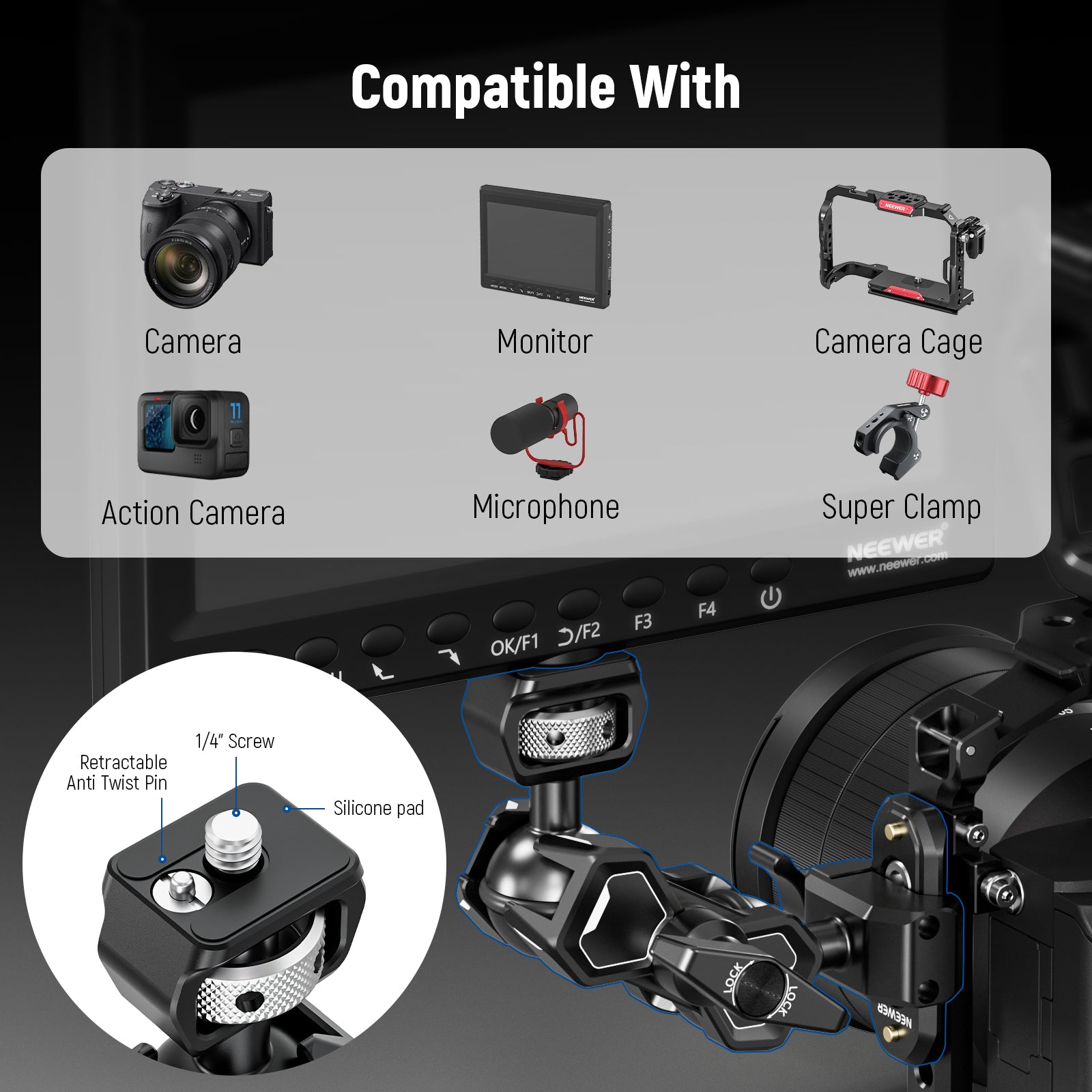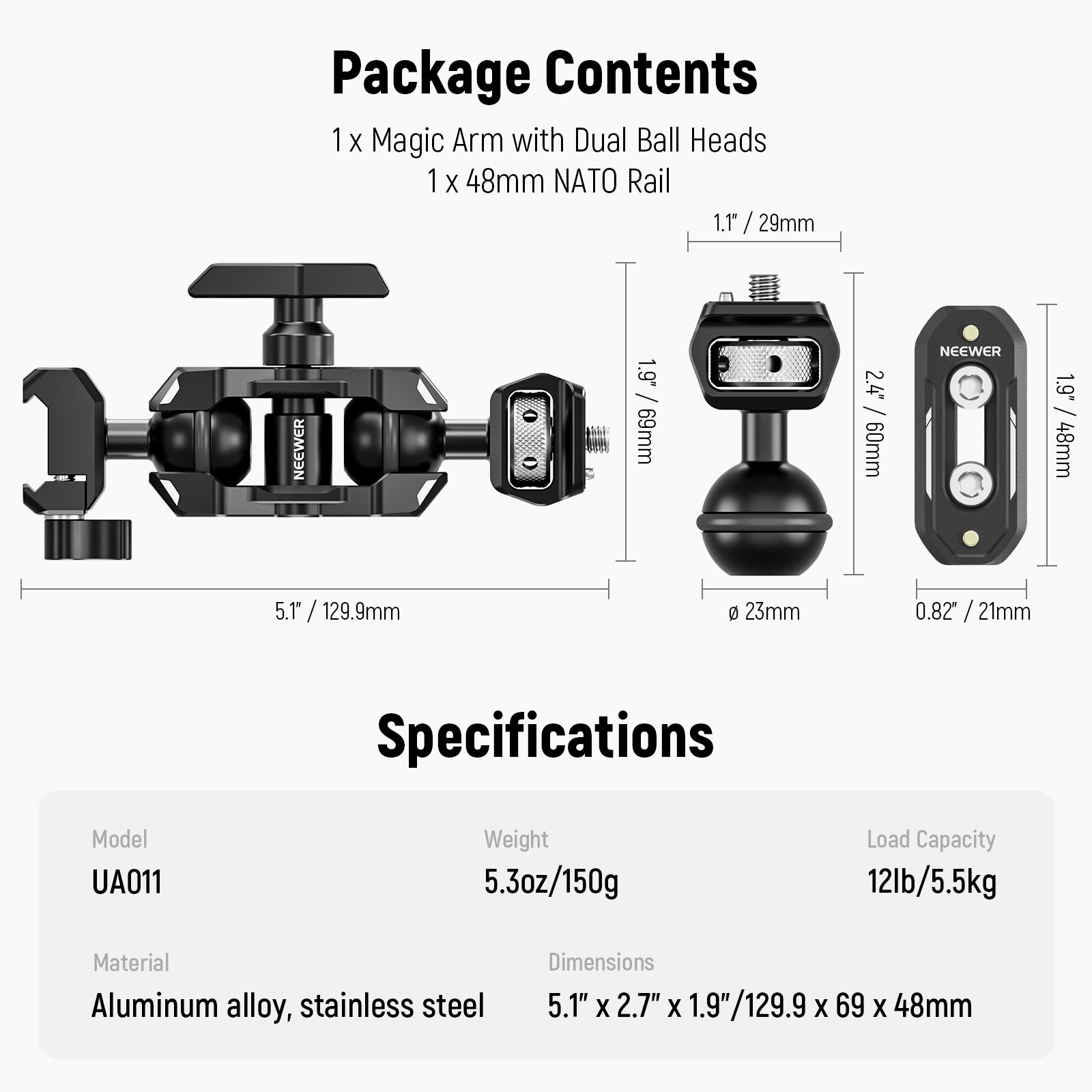 • Dual Ball Heads with 1/4" Screw & NATO Clamp- With a maximum load capacity of 12lb (5.5kg), the dual ball head magic arm features a NATO rail clamp for quick installation and flexible positions (a 48mm NATO rail is included), and a 1/4" screw with a retractable anti twist pin for field monitors, flashes, action cameras, microphones, and other accessories