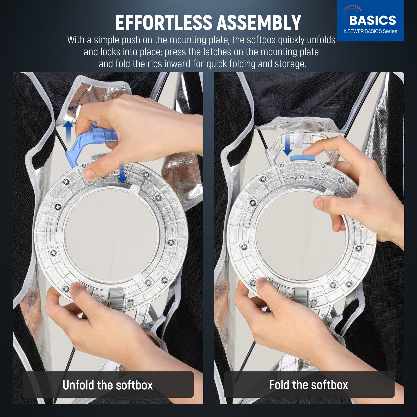 - Effortless Assembly- With just a simple push on the mounting plate, the softbox effortlessly unfolds and locks into place. Use the loop and hook fasteners to secure the included diffuser layers and grid, and it is ready for use. When it's time to pack up, push the latches on the mounting plate and fold the ribs inward for quick release. The resilient and robust ribs give this softbox incomparable durability that can withstand tens of thousands of presses without deformation for years of use