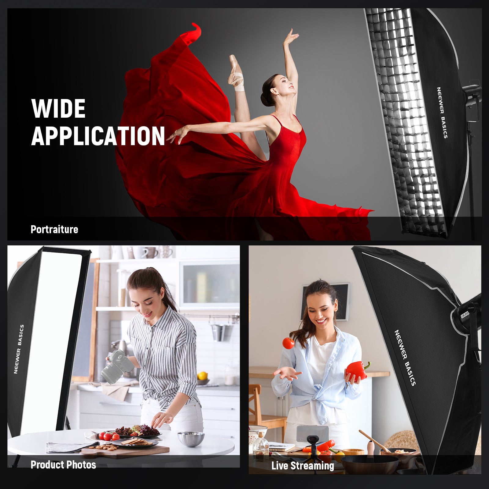 - Customizable Honeycomb Grid & Diffusers- For various shooting scenarios and photography styles - be it portrait, still life, photo, film, live streams, studio camera photoshoot, video recording, filming or streaming, the NEEWER softbox lighting kit includes a honeycomb grid for more confined and directional light, and two diffusion panels attaching via touch fasteners to soften glare and eliminate shadows. Essential soft box set as content creator accessories and influencer must have equipment