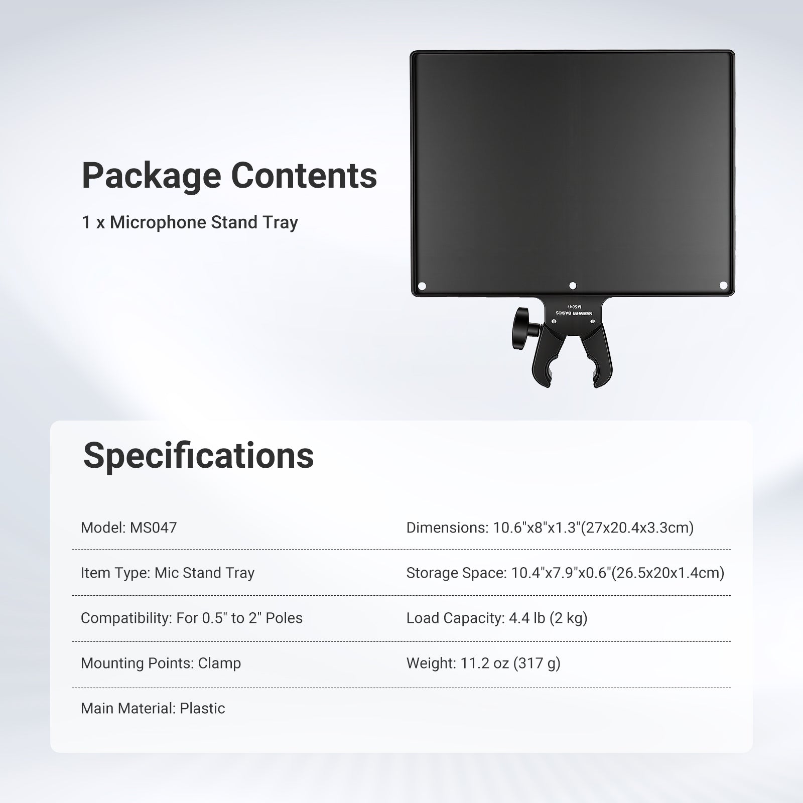 - Microphone Stand Tray- The mic stand clip on tray measures 10.6" x 8" x 1.3" (27 x 20.4 x 3.3cm) for tuners, phones, capos, headphones, and small accessories up to 4.4 lb (2 kg). Made of plastic, it weighs 11.2 oz (317 g) for on the go