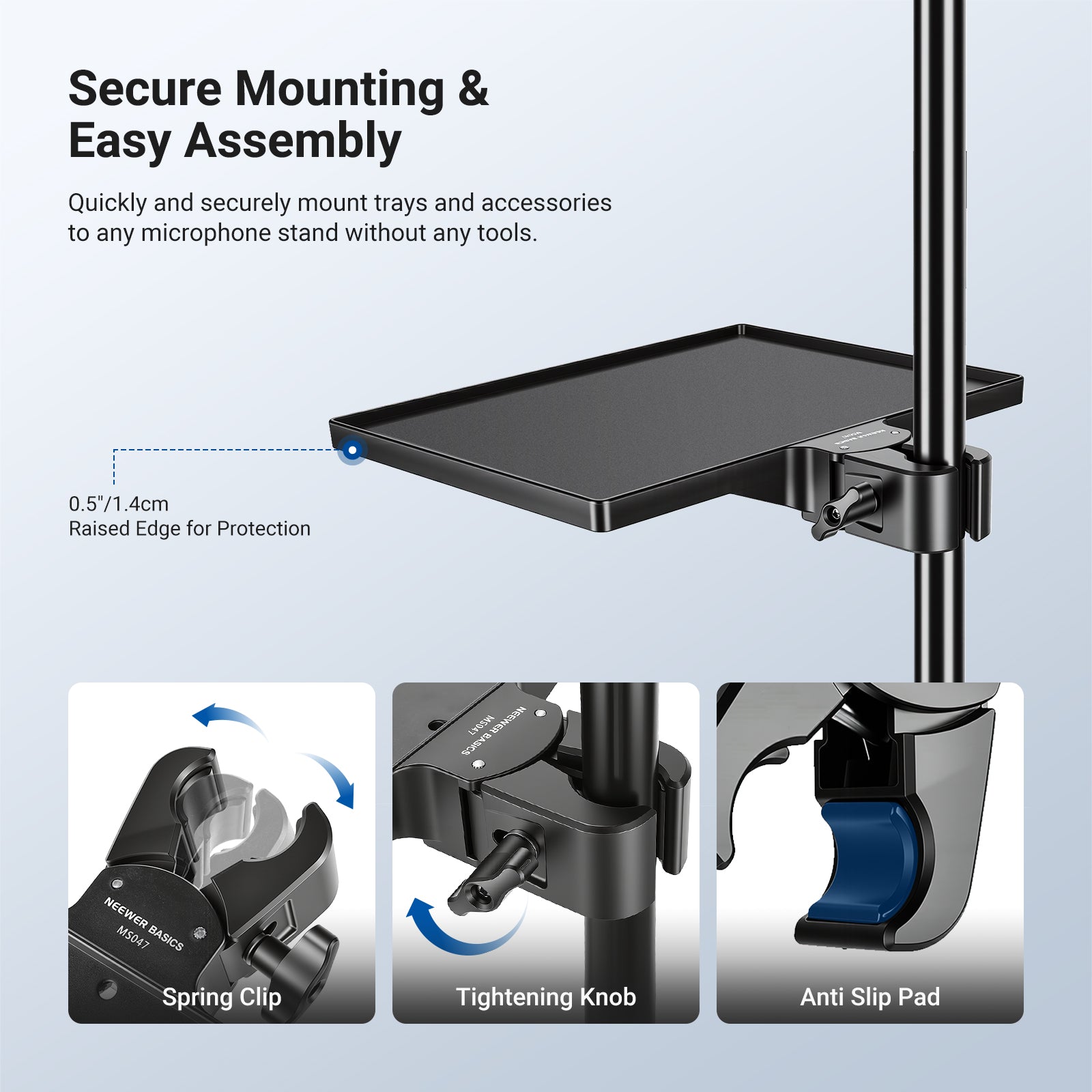 - Secure Mounting & Easy Assembly- The clamp on shelf adopts a spring loaded crab clip and a hand tightening knob for quick, secure mounting of the tray holder and your accessories on any mic stand like microphone floor stand or desk stand, with no extra tools