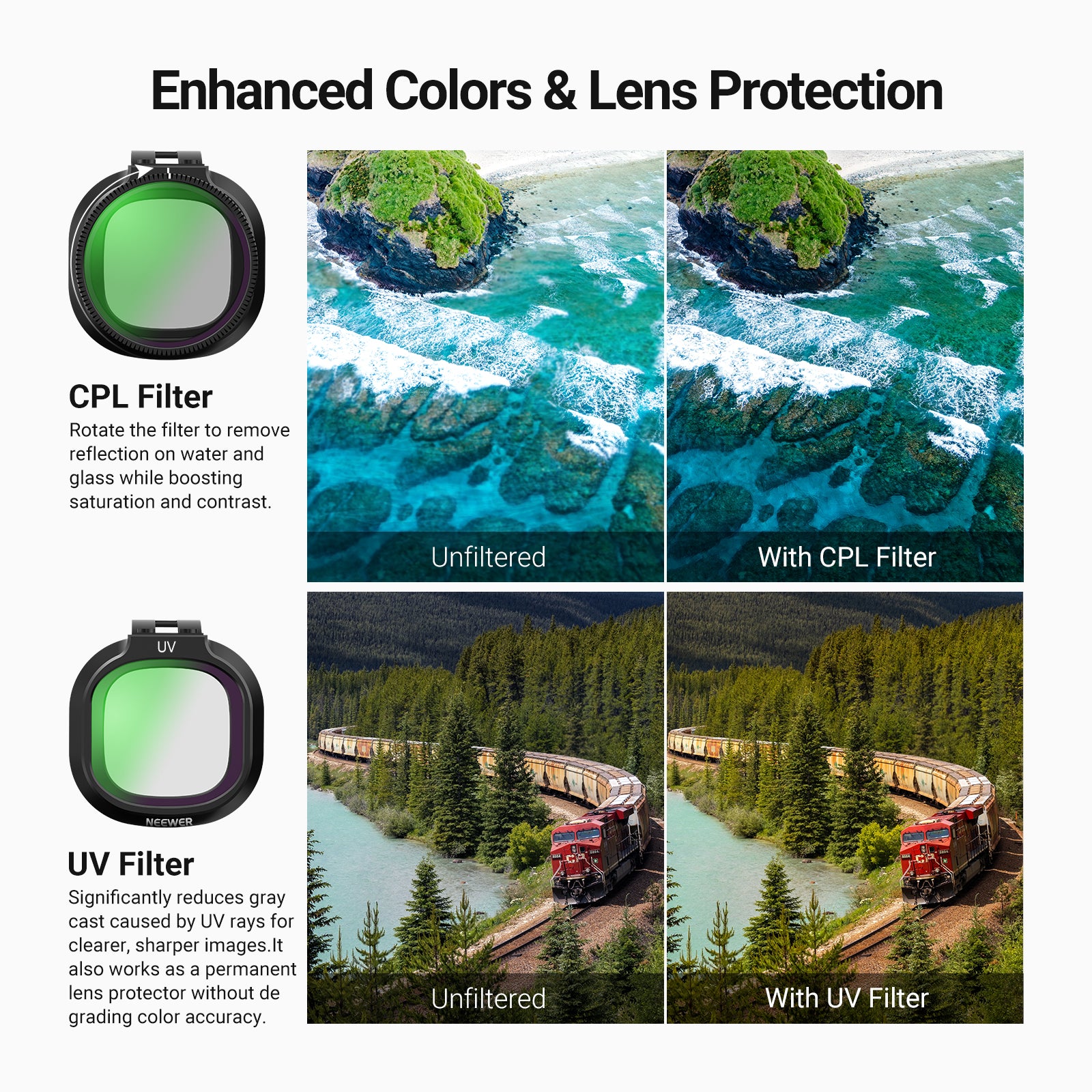 - Compatible with DJI NEO 2- Only compatible with DJI NEO 2 Drone. This filter accessories kit includes 1x UV, 1x CPL (circular polarizing), and 4x ND filter. Lightweight and slim, they preserve the precise gimbal performance