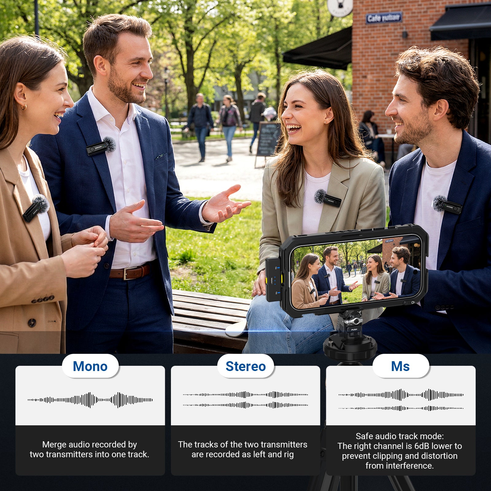 - 360° Pickup & Stereo Sound- Omnidirectional condenser mic allows 360° uncompressed sound pickup. Transmitters record sound in four independent audio tracks as portable content creator essential clip on wireless microphone and influencer must haves for YouTube starter kit/TikTok vlogs, interviews, live streams, and broadcasts