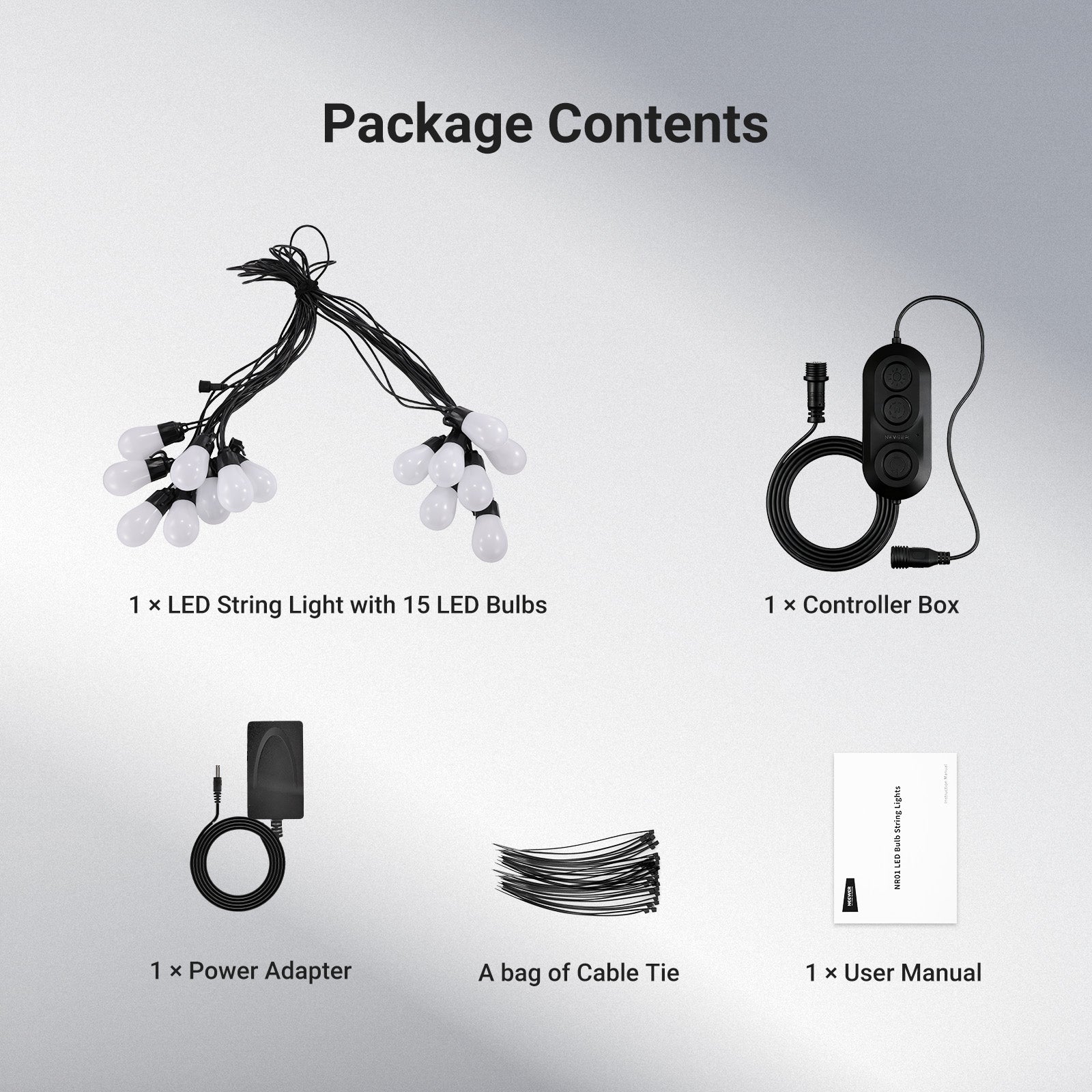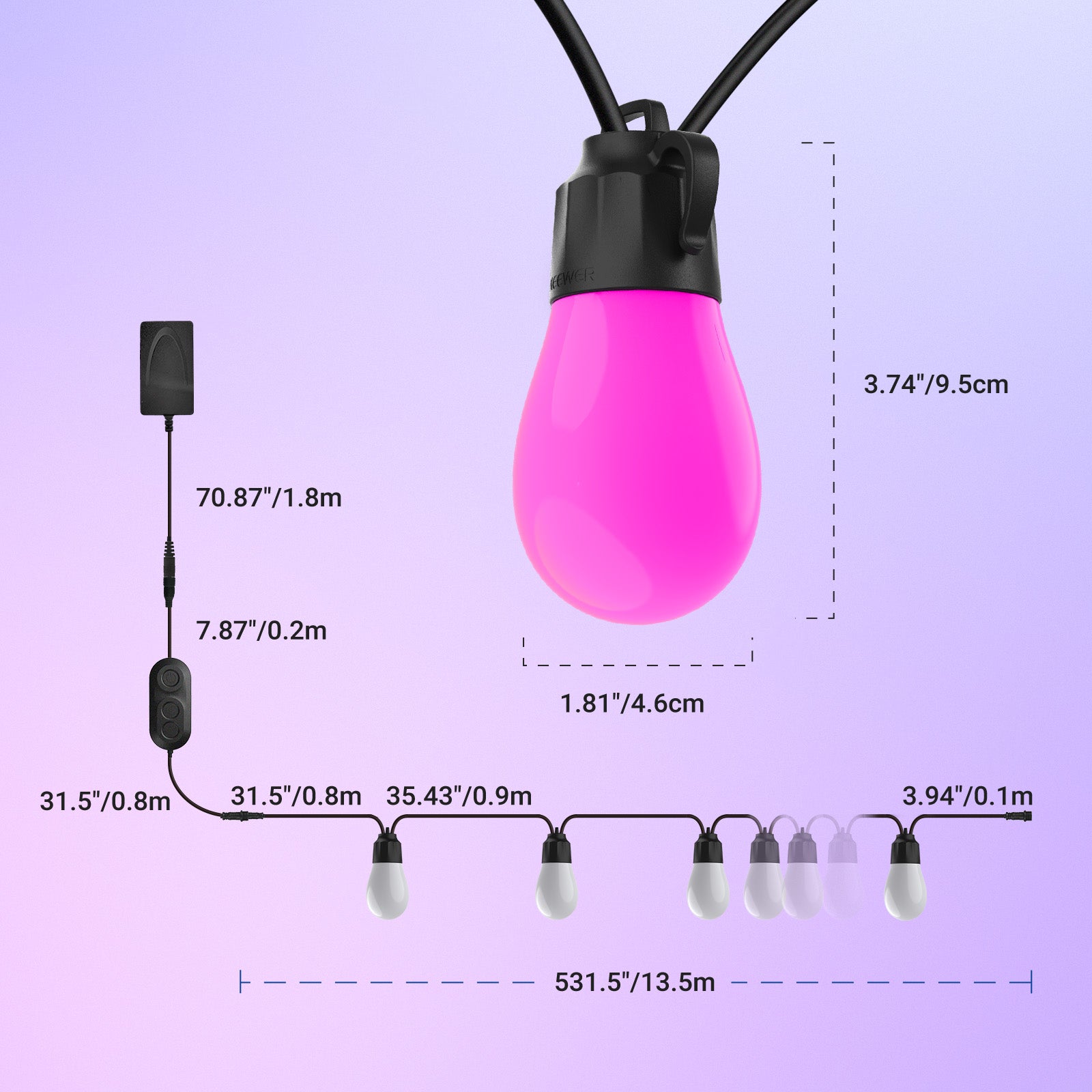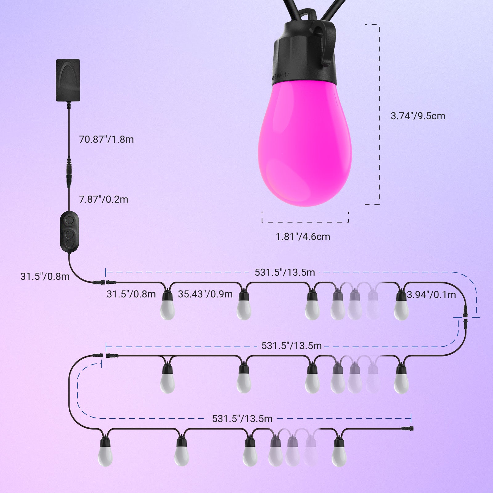 - Fascinating RGBW Effects & Individual Control- Each led string features 15 dimmable RGBW bulbs (2700K-6500K, up to 80lm per bulb) for a soft glow and warm cozy ambience. Each bulb can be set to different colors. RGB lighting for Christmas, holiday patios decoration, gazebos, terraces, pergolas, backyard, apartment out door balcony, outside bistro/cafe/bar, yard, deck, or as permanent outdoor light products for house, camper camping, indoor bedroom classroom dorm party waterproof decor, etc