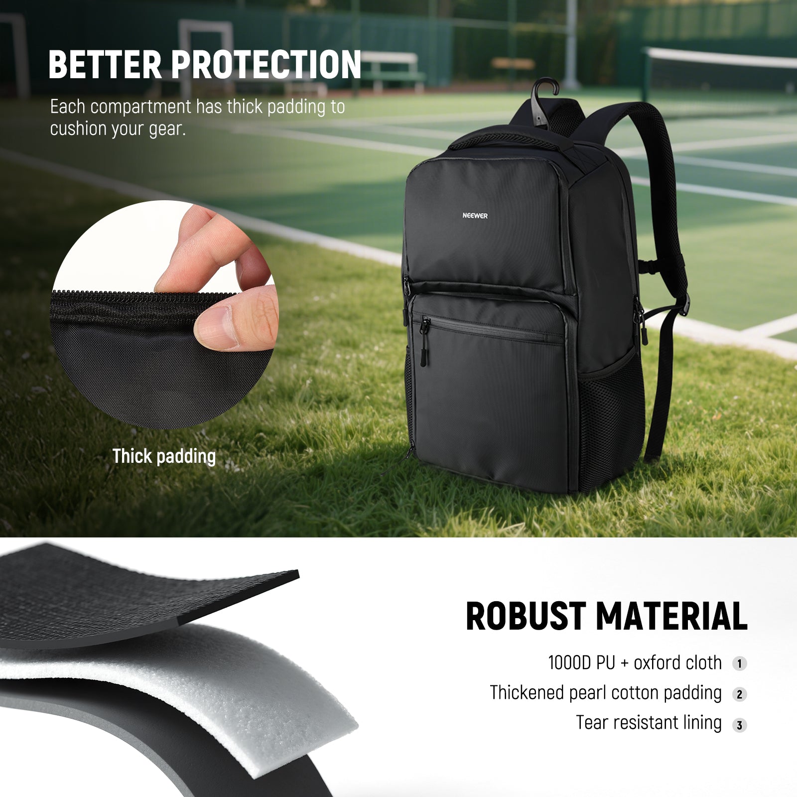 - Keep Things Organized- Multiple compartments keep everything in place: a dedicated pickleball compartment, a padded paddle section, two front pockets for clothes, towels, or accessories, a shoe compartment with a dustproof cover to keep dirt contained, and dual side pockets for water bottles or energy drinks