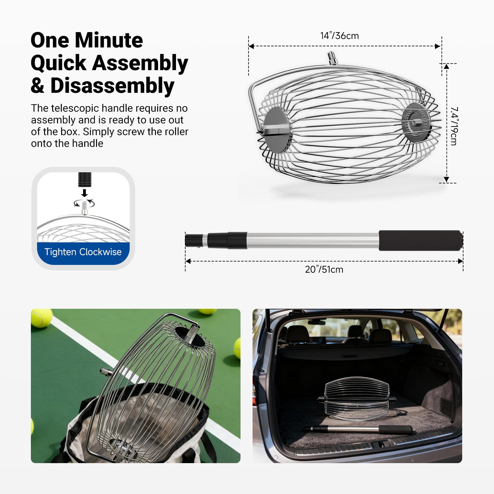 - Rugged Build & Easy to Operate- The handle is made of lightweight, high strength aluminum, making it easy to handle. The roller, crafted from stainless steel wires, resists rust and deformation while remaining flexible enough to let balls roll in effortlessly. To release the balls, simply spread the wires apart by hand. Ideal gear as pickleball tennis practice accessories and pickle ball training equipment