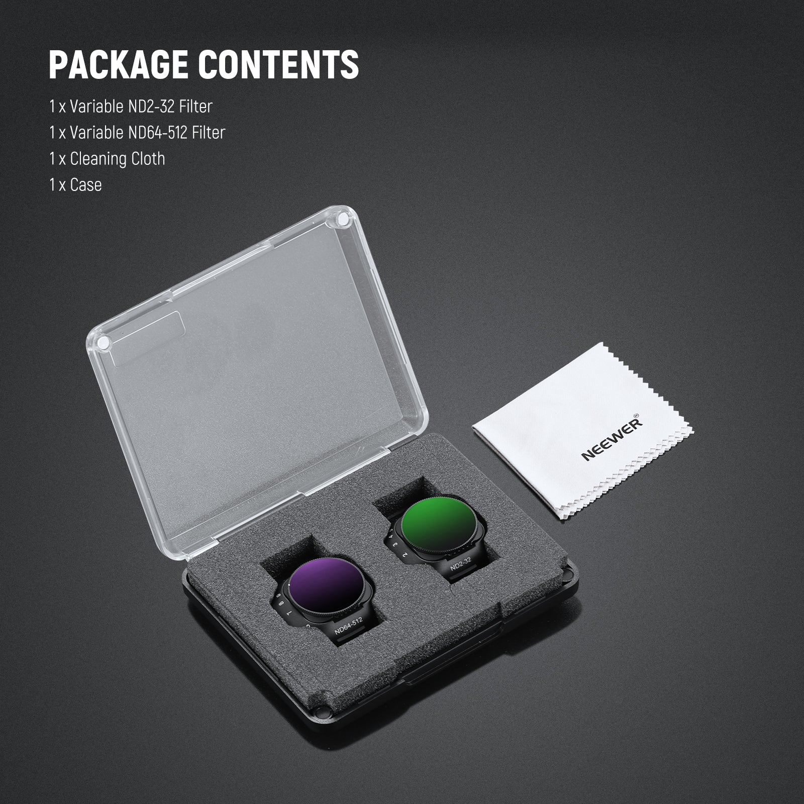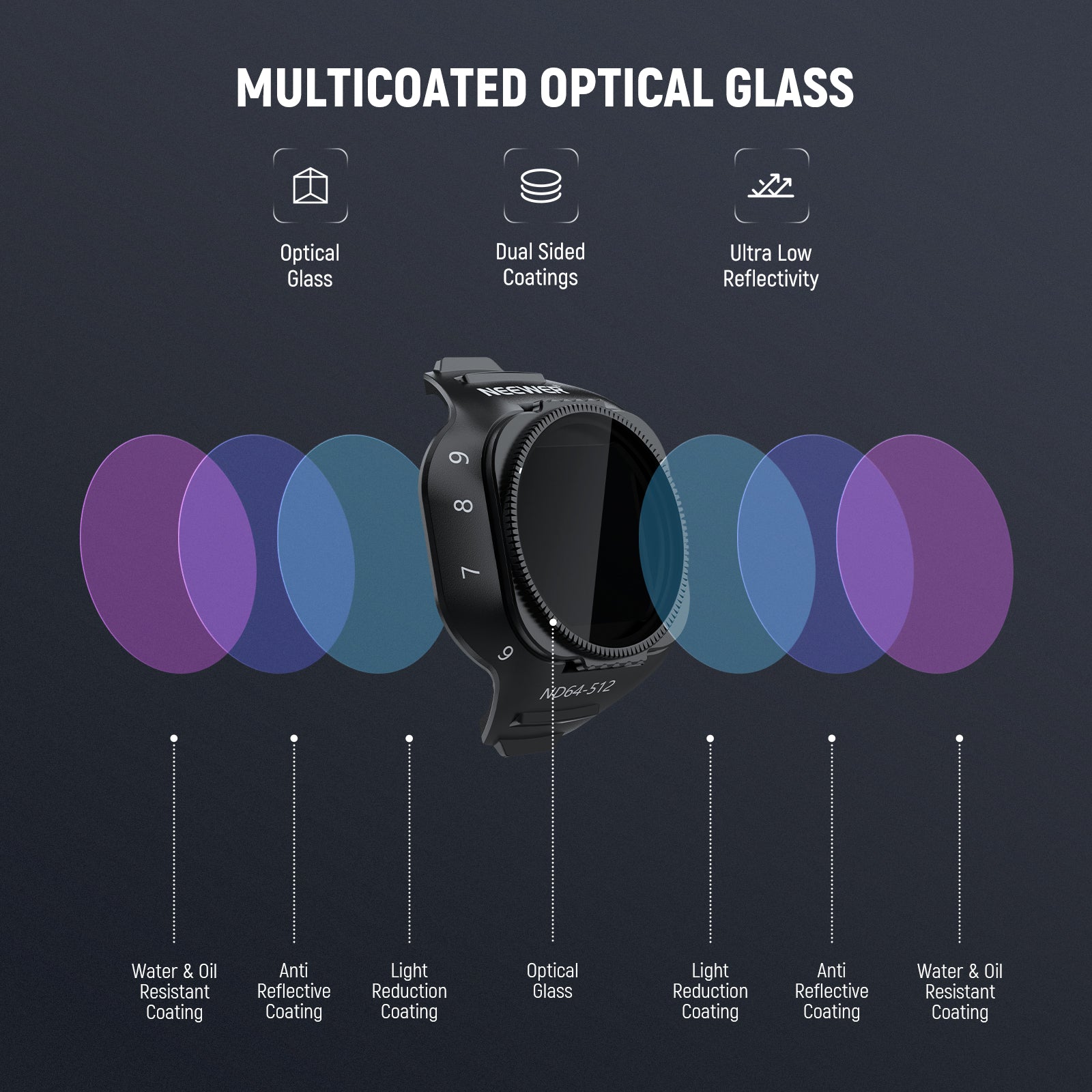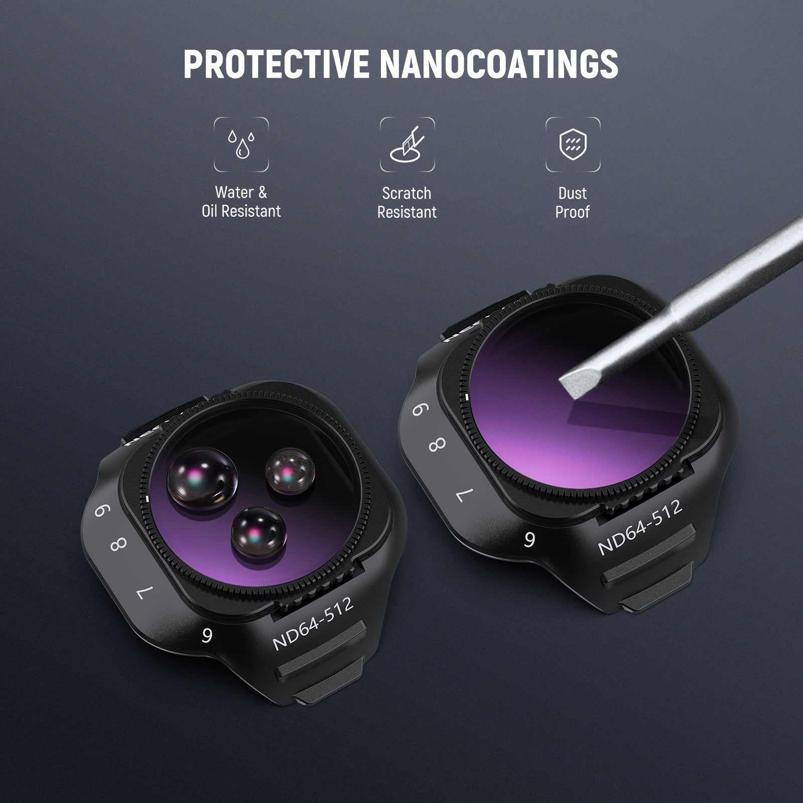 - Flexible Exposure Control- Variable neutral density filters (ND2-32 & ND64-512) reduce light by 1-5 & 6-9 stops respectively to prevent overexposure in different conditions and allow you to capture rivers, waterfalls, and light trails with dynamic motion blur