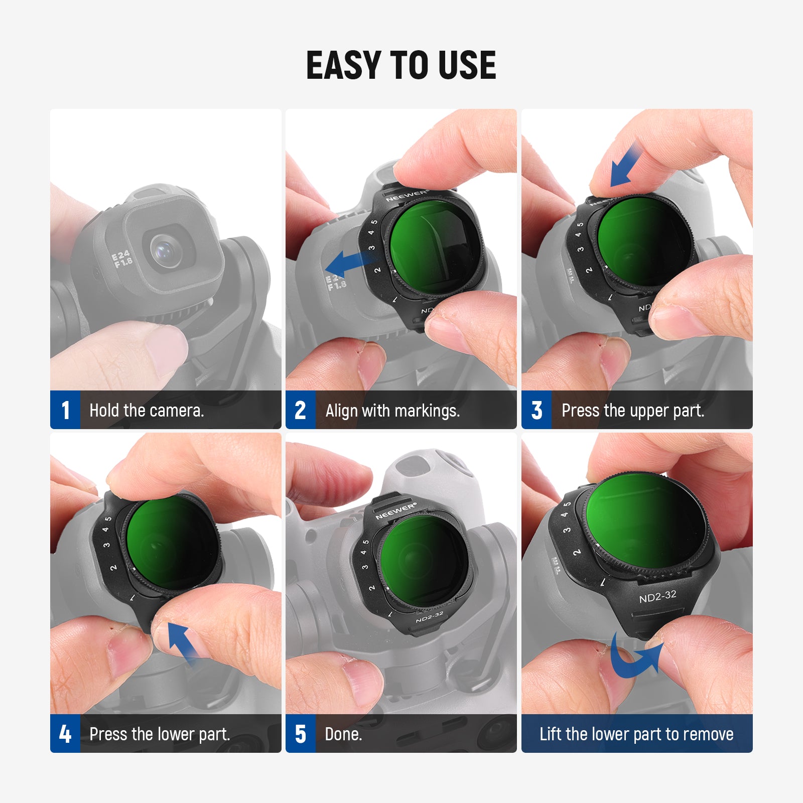 - Easy ND Level Adjustment- Rotate the frame to align with markings for precise neutral density value adjustment. With a detachable design, the filter and base can quickly combine and separate via magnets