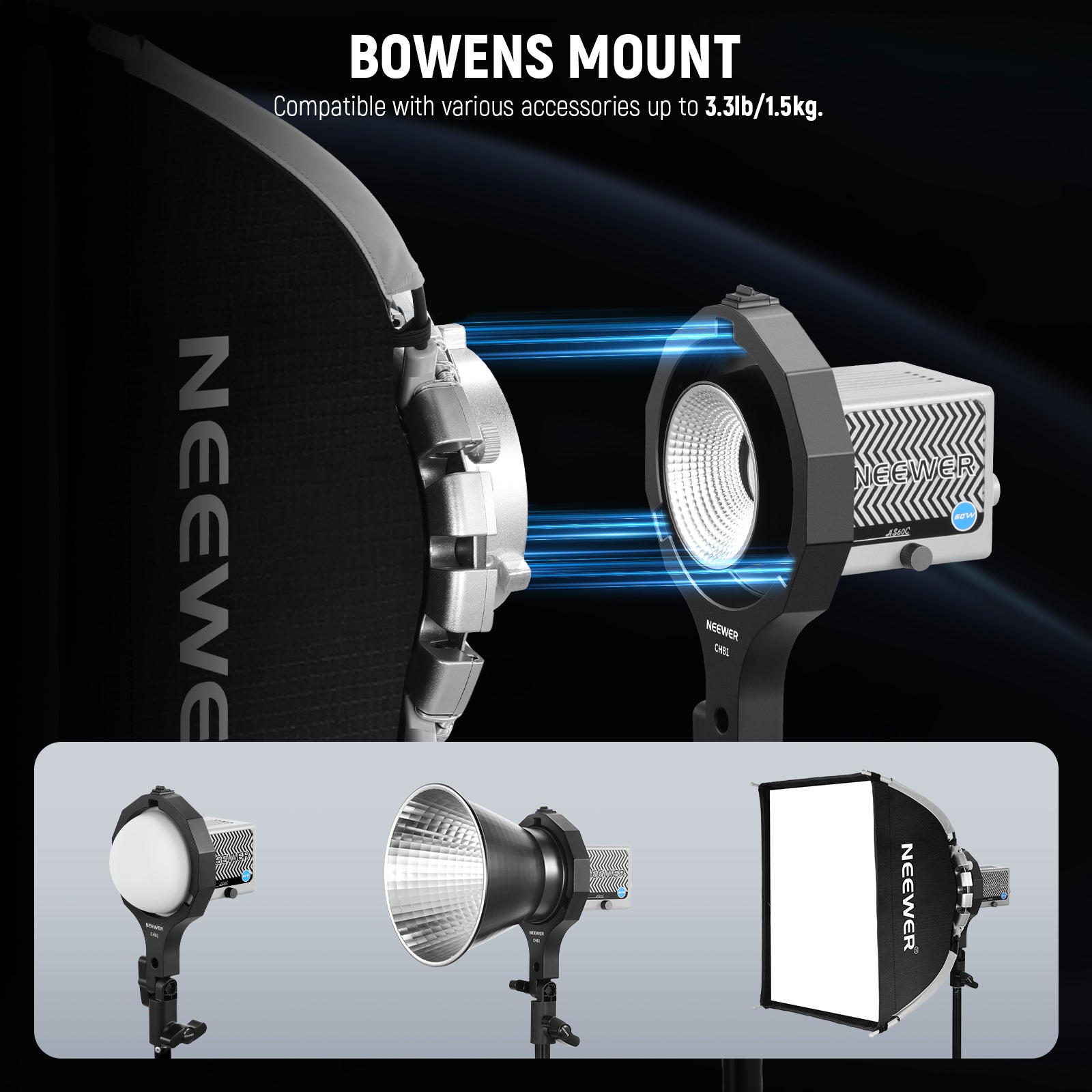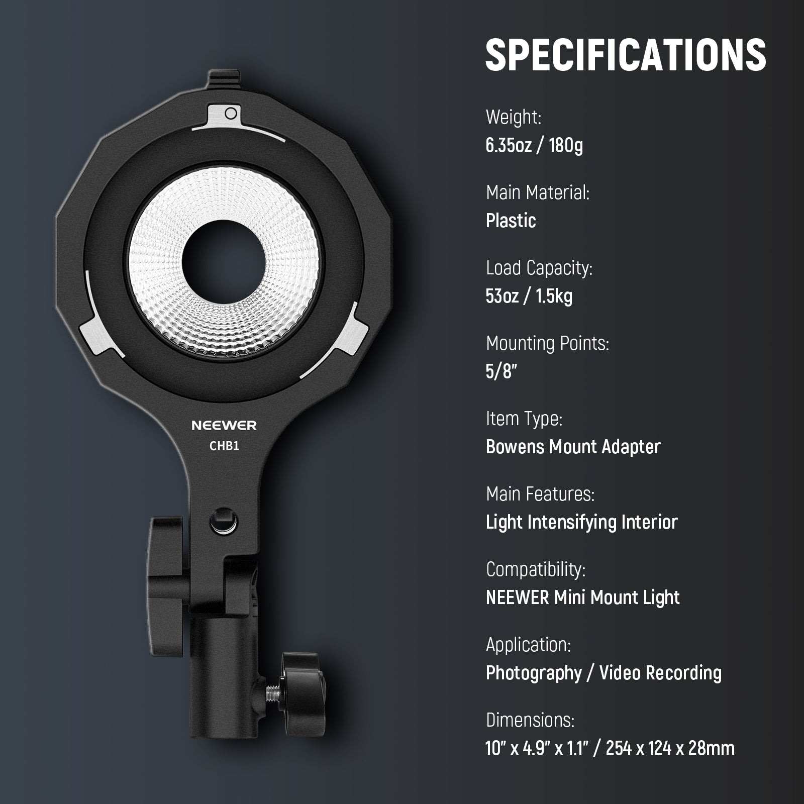 - NEEWER Mini to Bowens Mount- CHB1 Bowens Mount Adapter makes NEEWER Mini Mount Lights (such as HS60B/HS60C) compatible with all Bowens mount accessories and light modifiers, including standard reflector, parabolic softboxes, lantern softboxes, and Fresnel lenses, for expanded creative possibilities