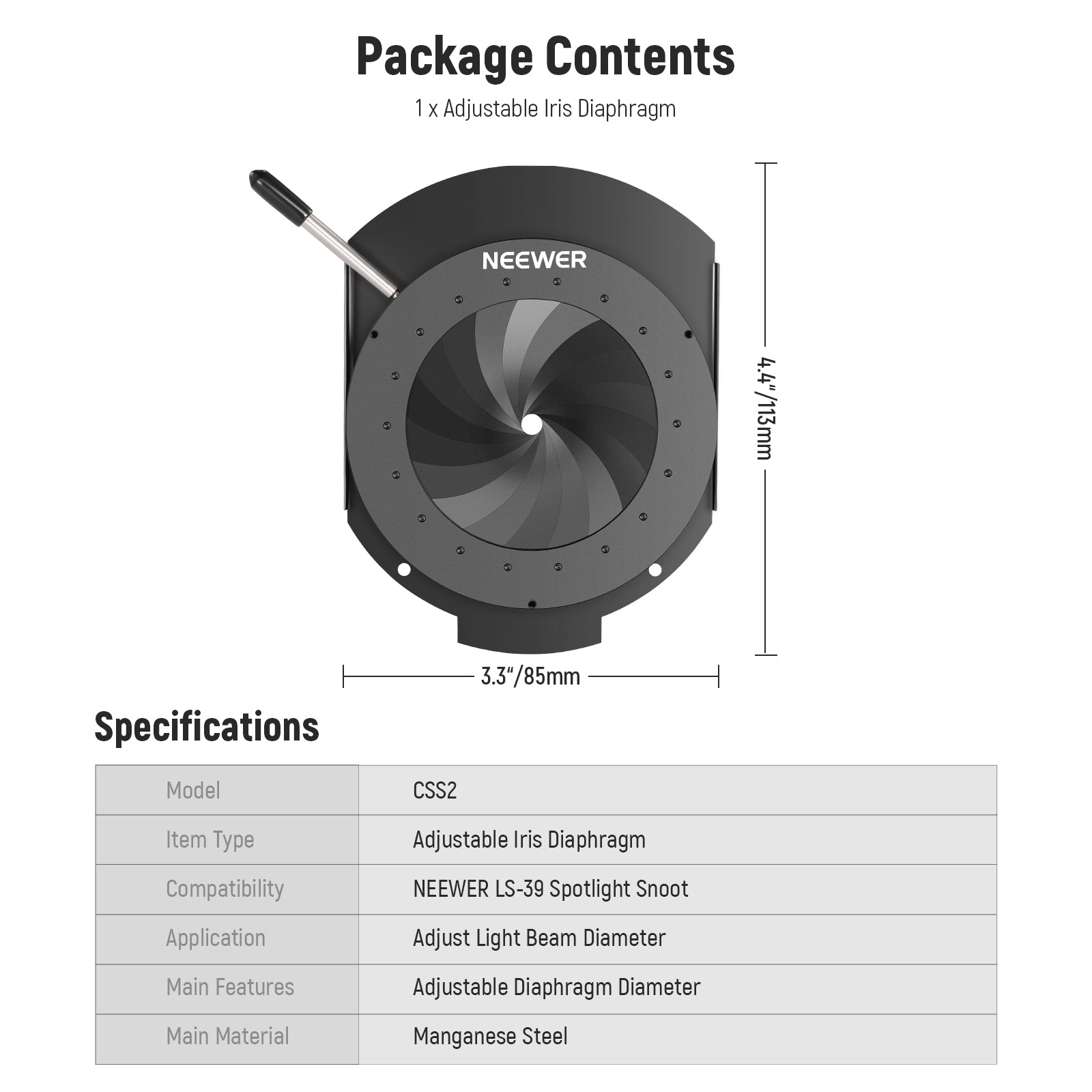 - Easy to Use- Simply put this iris diaphragm into the drop in slot of the NEEWER LS-39 spotlight snoot, and rotate the handle to change the diaphragm aperture diameter, eliminating the burden of changing different iris diaphragms