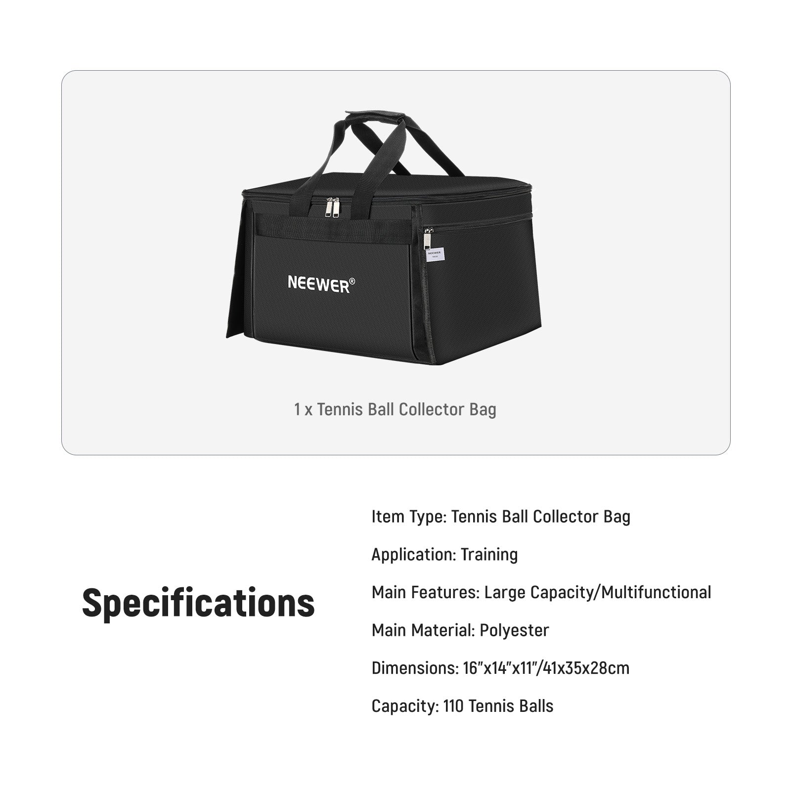 - Sufficient Storage Room- Measuring 16"x14"x11"/41x35x28cm, the NEEWER tennis ball hopper offers ample space to additionally hold tennis balls beyond the TB01S ball picker. Its wide, large zippered opening provides easy access, simplifying the loading and unloading of balls to enhance the practice and training experience for tennis