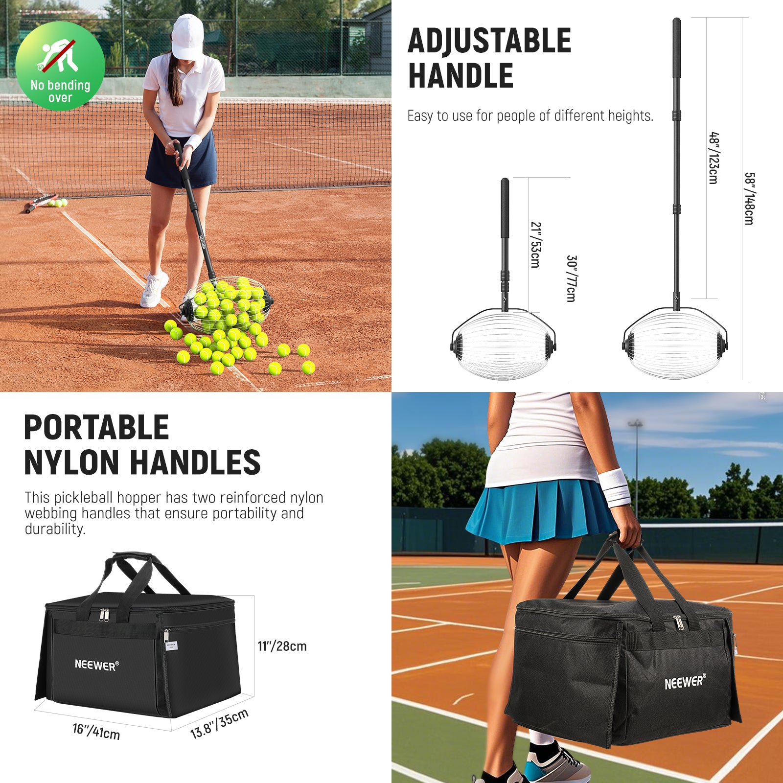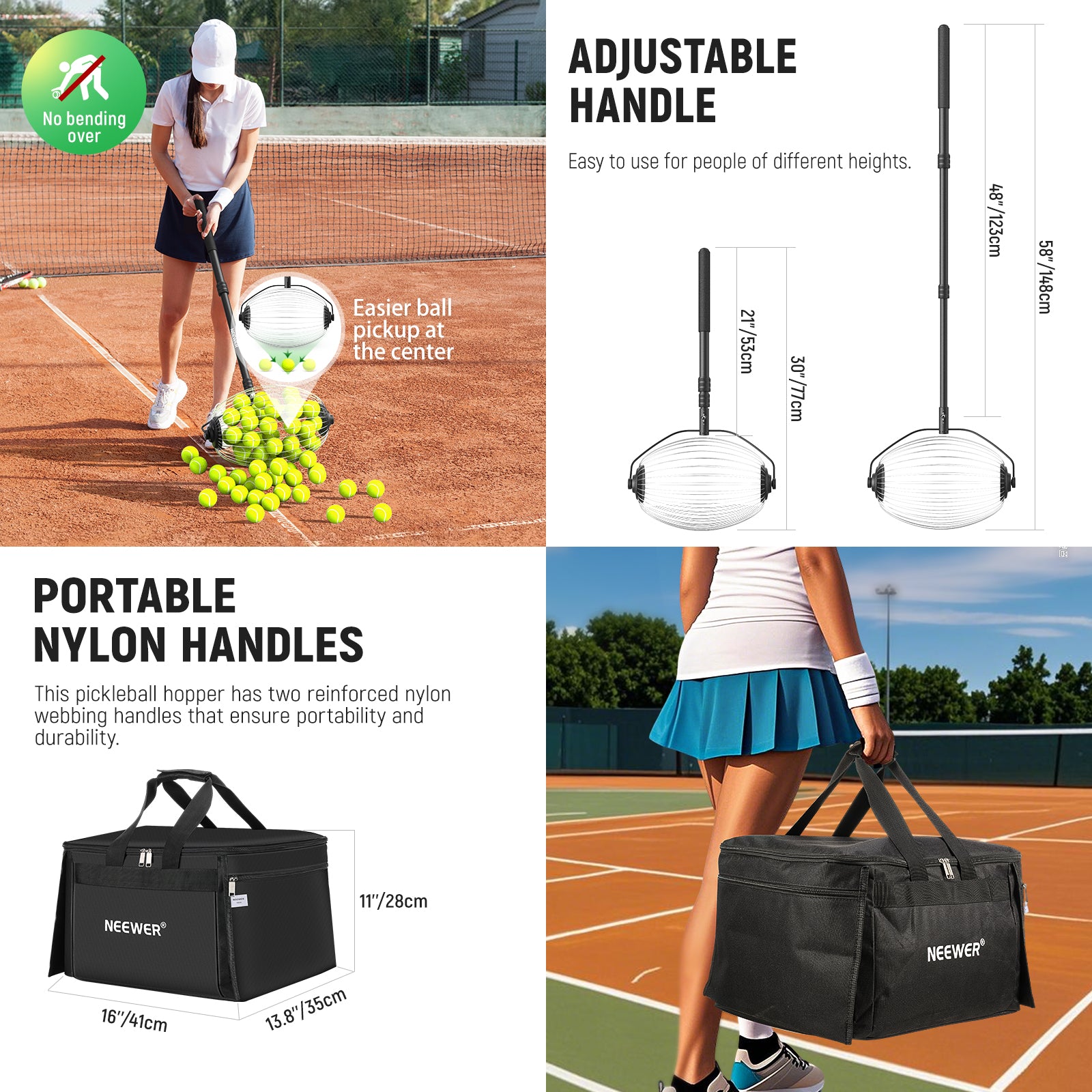 - Adjustable Height for Optimal Comfort- The telescopic handle allows you to adjust the tennis ball collector's height between 30"-58"/77-148cm to accommodate users of different heights, with the end covered in soft, nonslip foam for a comfortable grip. It ensures a pleasant experience for everyone, saving time and avoiding unwanted hassle, so you can focus more on your practice
