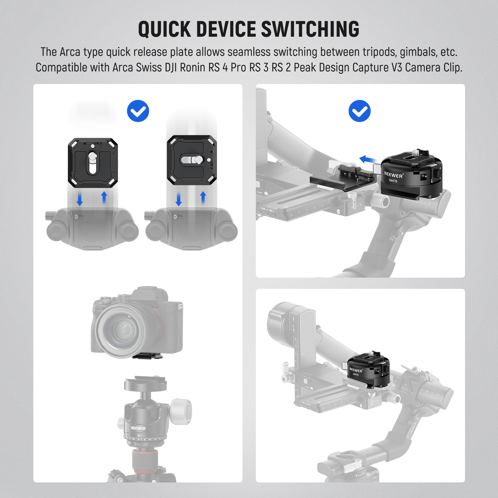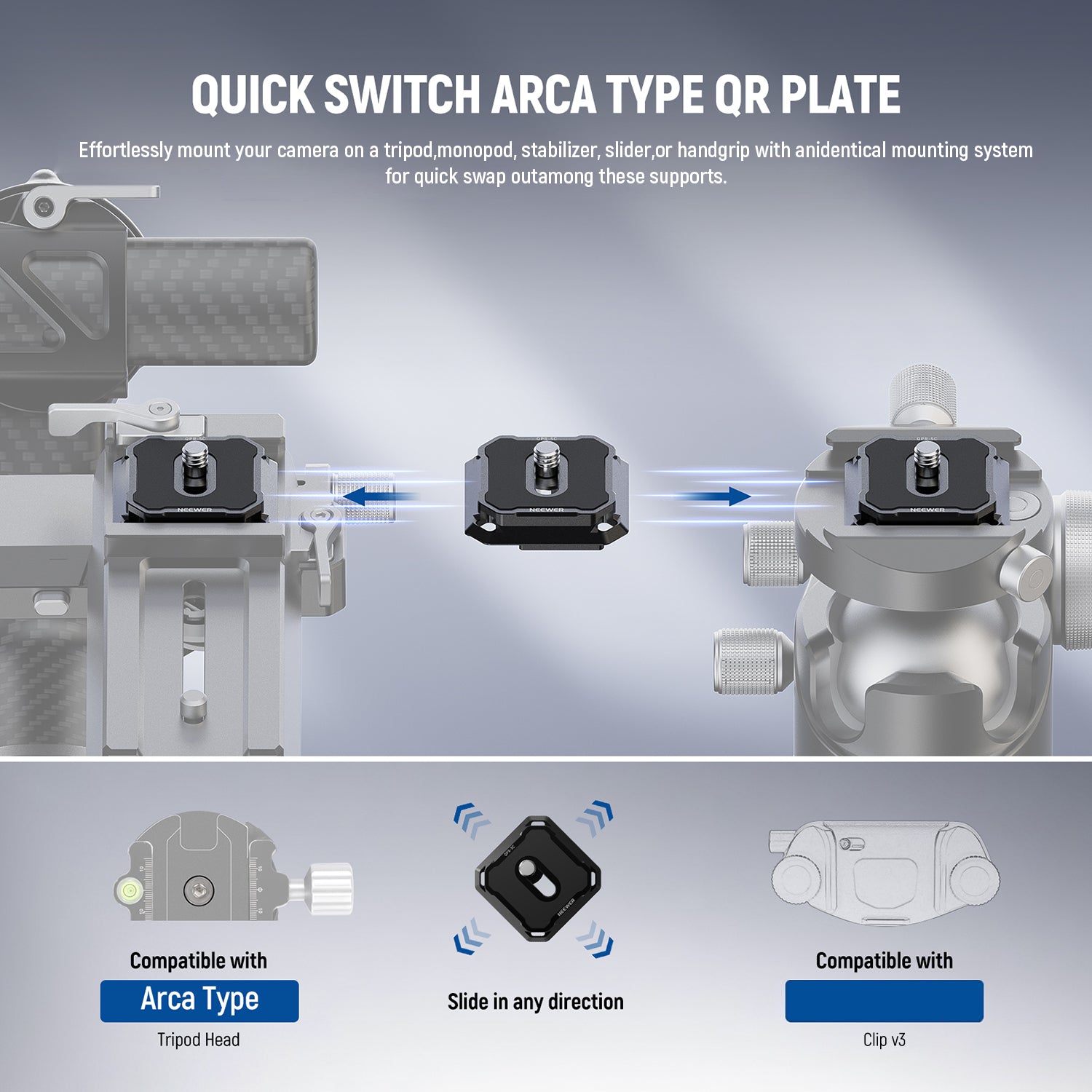 NEEWER quick release plates provide a fast and secure way to attach and detach cameras, camcorders, and other photography gear from tripods, sliders, and gimbals. Designed for stability and precision, these tripod mounting plates keep your equipment firmly in place while allowing effortless setup and adjustments. Made from durable, high-quality materials, our quick release plates deliver long-lasting performance for both studio and on-location shoots. Explore our collection to find the perfect camera mounting plate for your workflow.