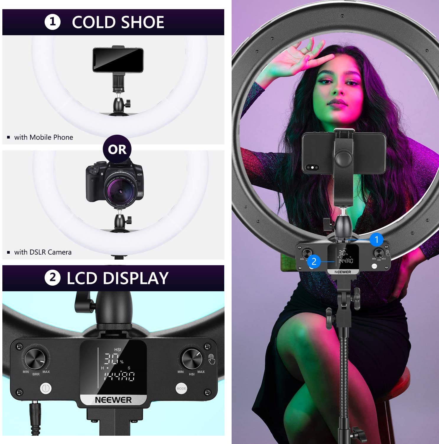 - Versatile RGB Ring Light- Neewer 18” RGB Ring Light is perfect for selfie, makeup, portraits, advertising, YouTube/TikTok, and Zoom calls. It delivers circular lighting from all directions to brighten your face, reduce shadows, and give you sparkling eyes. 288 SMD LED beads produce soft and flicker-free illumination to make your subjects beautifully lit in front of the camera. 97+ CRI ensures actual color reproduction