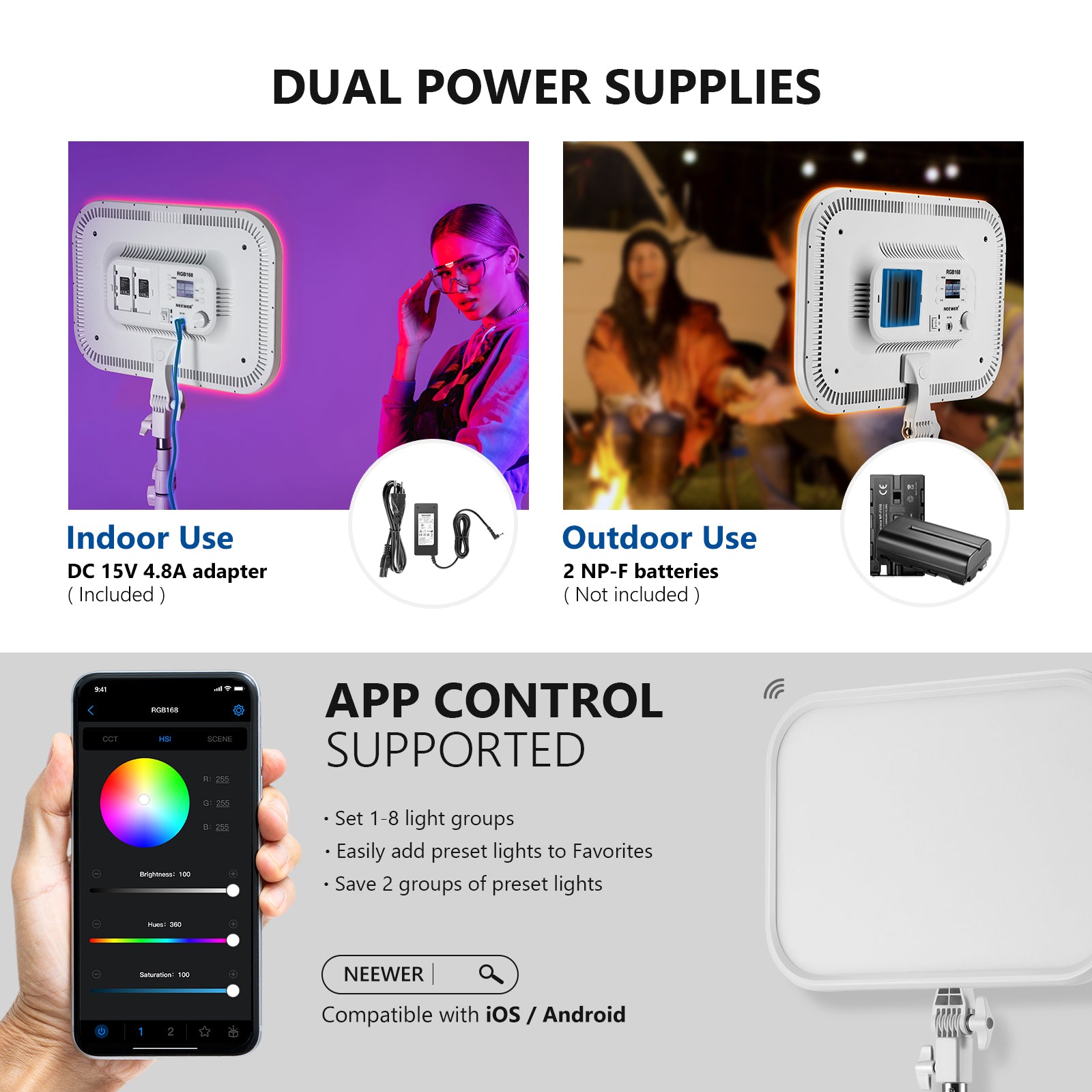 - Sturdy Light Stand & Dual Power Options- The lighting & studio equipment includes 2pcs RGB168 lights, 2 pcs 78.7"/200cm light stands and a carrying bag for the kit. The detachable mounting bracket allows for quick installation on the tripod stand. 2 power supply methods—the photo light can be powered by the DC 15V 4.8A adapter (included) or 2 NP-F batteries (not included)