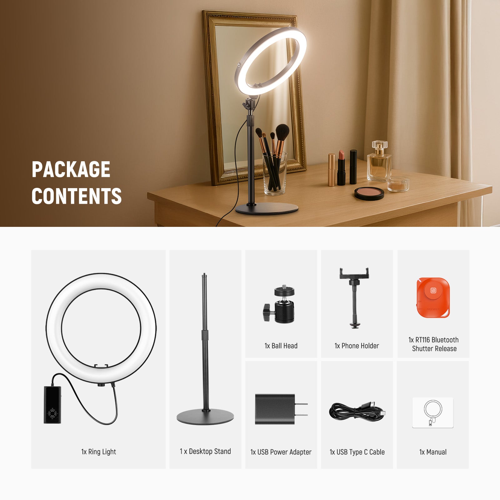 - Compact and Portable- This small lightweight LED desk stand phone ringlight kit compatible with iPhone. Desk ring light with stand, key light or soft fill light, selfie ring light, makeup light for makeup artist, Zoom lighting for computer, video podcast lighting, laptop light for video conference and calls, social media vlogs, streaming, etc.
