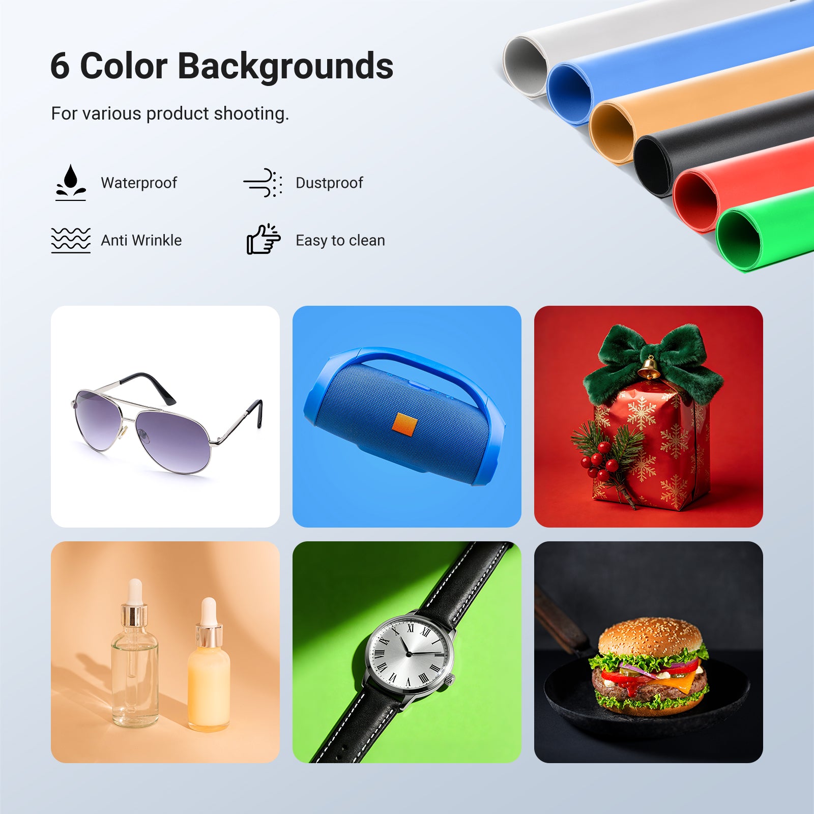 • 6 Colors of Backdrops- The studio photography equipment kit includes 6 backdrops to customize various shooting environments. At 12"x12"x12", the photobox is ideal for shooting food photos, electronics, jewelry, cosmetics, and other small to medium sized items