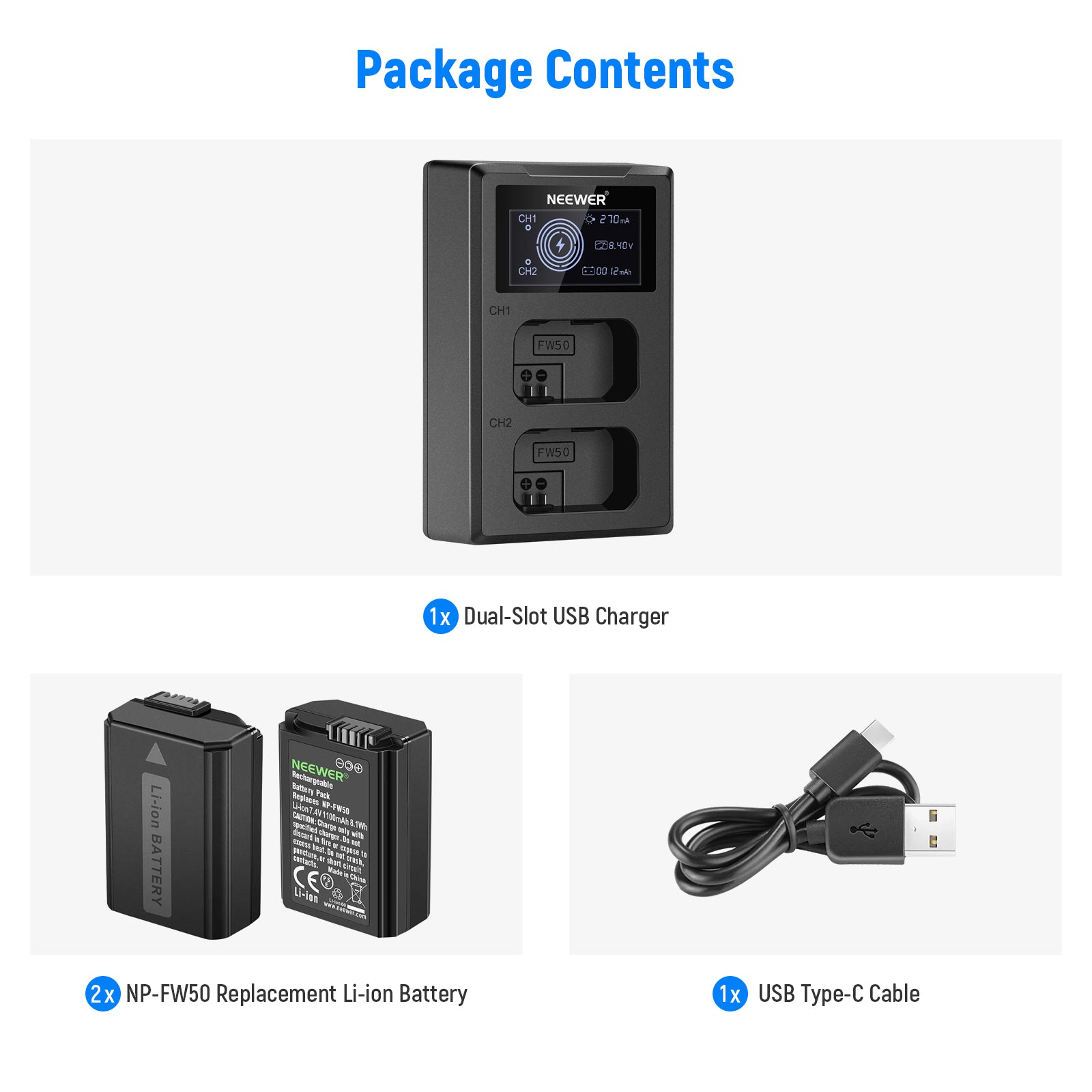 - Sufficient Battery Power- Do you want more battery power when shooting outside. Then this NP-FW50 replacement battery charger set is made for you. Two 1100mAh rechargeable batteries provide long-lasting battery power for taking more photos and videos