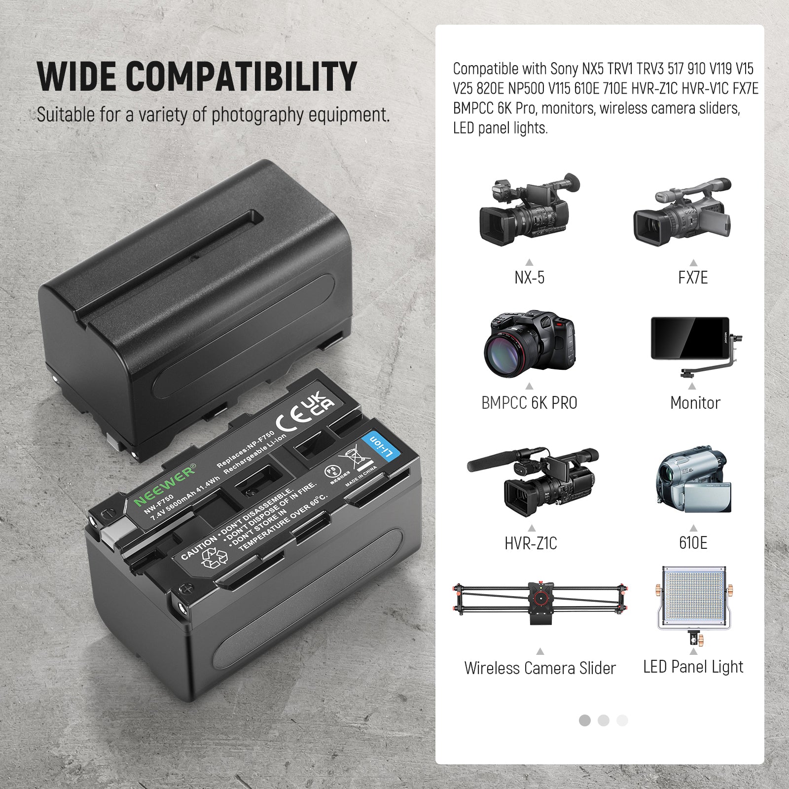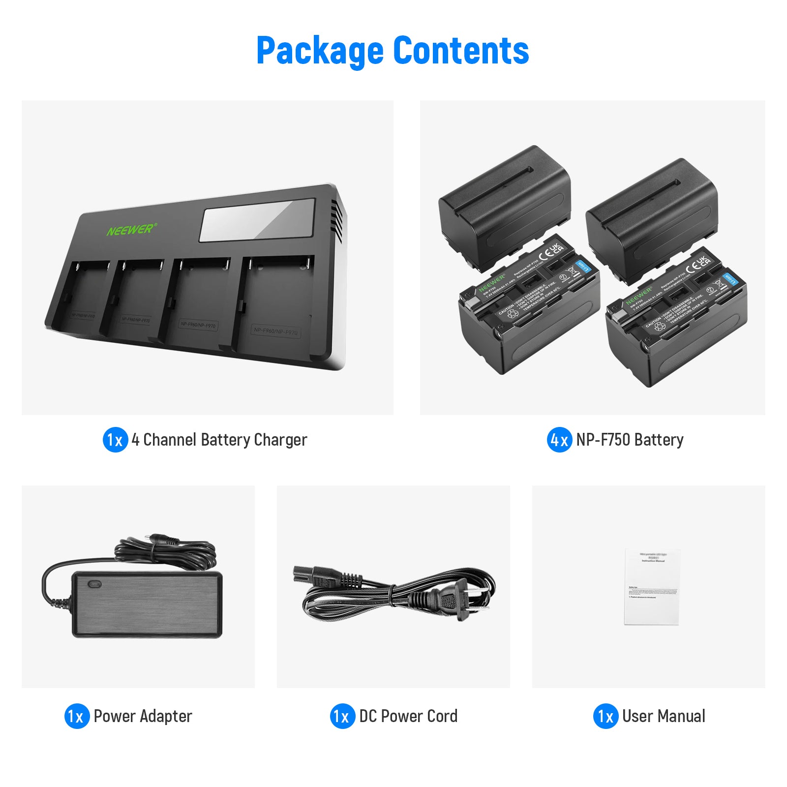 - Wide Compatibility- NP-F750 batteries power any device with an NP-F battery plate, compatible with Sony camcorders and video cameras, NEEWER field monitors, ring lights, and LED video lights. The 4-channel charger fits NP-F550, 570, 750, 770, 960, 970, 975, and other NP-F L series batteries