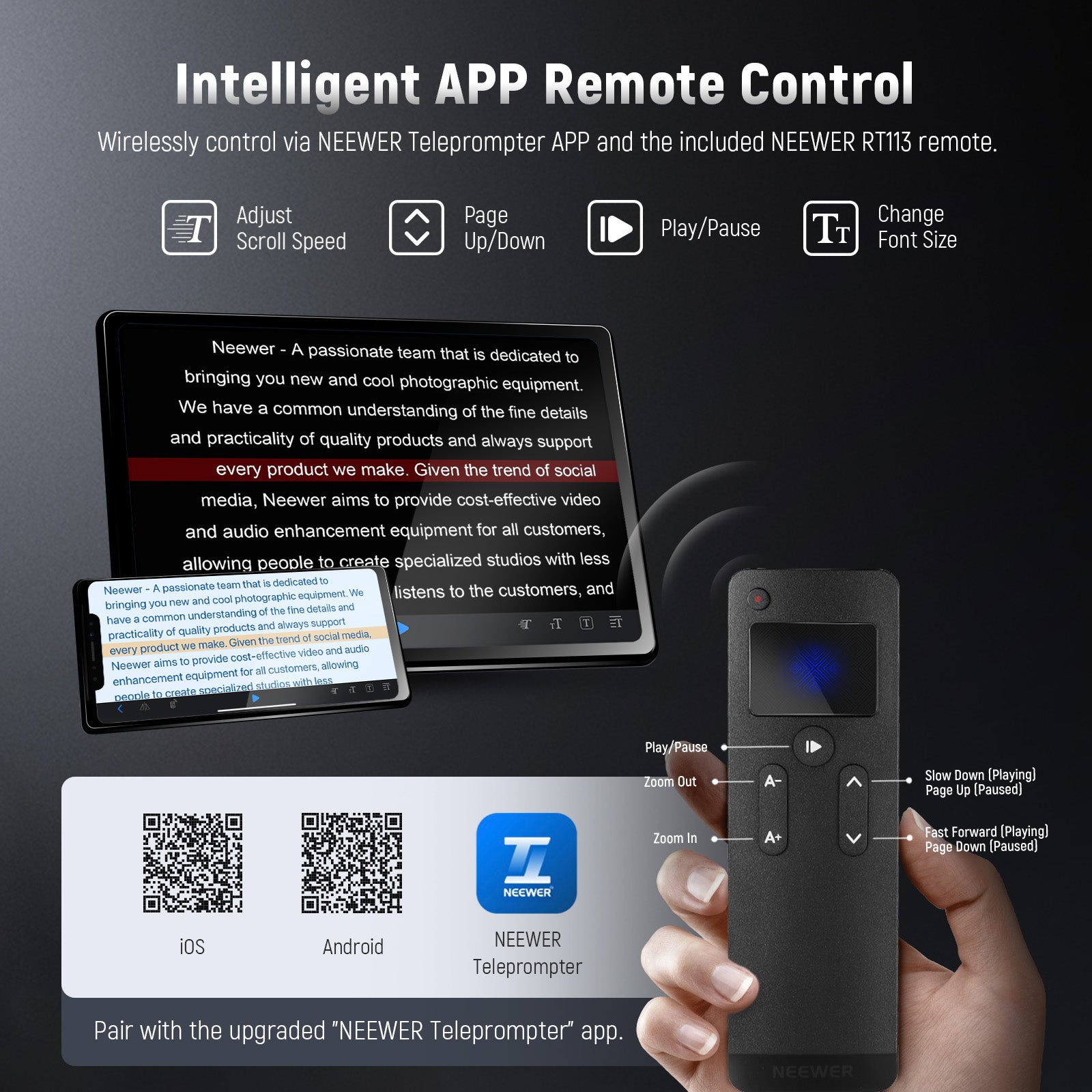 NEEWER professional teleprompter allows you to read every word of your script smoothly while maintaining eye contact with the audience. These teleprompters are perfect for recording natural and engaging videos using smartphones or cameras and are compatible with iPads, phones, cameras, and tablets. Choose a professional teleprompter for recording speeches, online courses, tutorials, news broadcasts, and presentations at home or on the go.